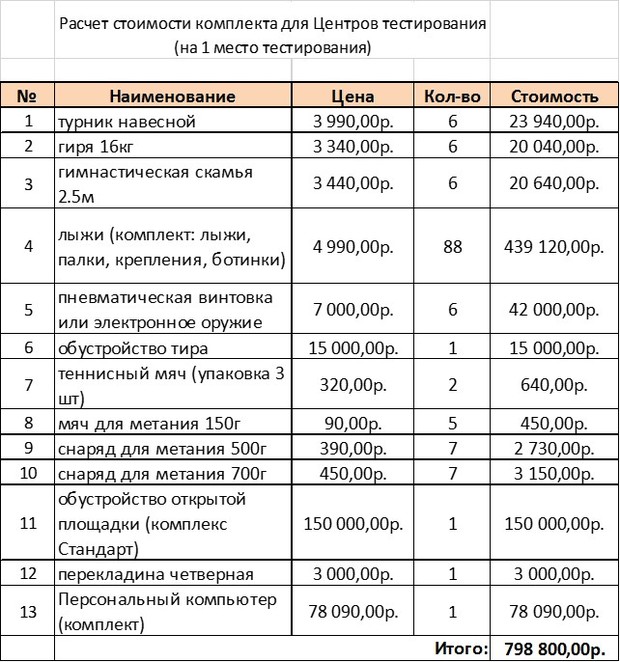 Что представляет из себя место тестирования, можно догадаться по описанию, содержащемуся на сайте федерального Минспорта. Там же есть и смета на его оборудование.
