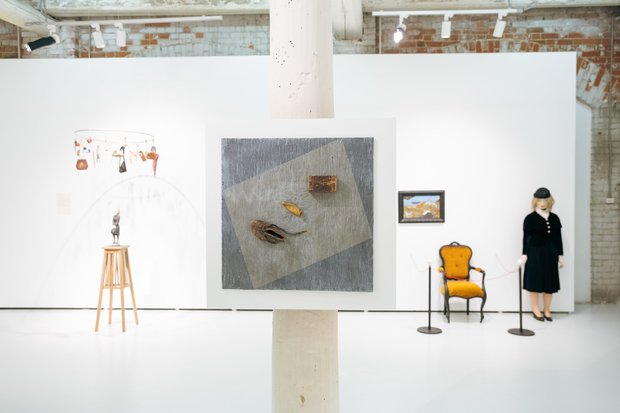 — Здесь нам было важно понять, как в ограниченное пространство с деревянными колоннами вписать 11 работ, да еще и так, чтобы рассказать с их помощью целостную историю. Мне кажется, у нас получилось. Мы увидели формальные совпадения — количество элементов в работах, количество элементов за рамками. Это пересчет чисел, с которого и начинается абстрактное мышление. У нас есть зеркальная симметрия. Среди массива работы мы обнаружили две инсталляции, у которых есть одинаковое количество элементов — по пять. Дальше, размышляя над этим, я пришел к мысли о том, что вижу в каждой из них вполне последовательный и развивающийся сюжет. Пять цифр, пять организованных зон, — пояснил Алешин.