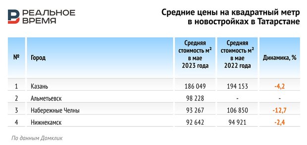 По данным сервиса «Домклик», средняя стоимость квадратного метра в Казани на первичном рынке недвижимости в мае составила порядка 186 тысяч рублей — это на 4,2% меньше, чем в мае прошлого года. В других крупных городах Татарстана цены также упали. В Набережных Челнах средняя стоимость квадрата сократилась за год почти на 13% — до 93 267 рублей, в Нижнекамске — на 2,4%, до 92 642 рублей.