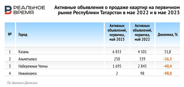 Число активных объявлений о продаже на вторичном рынке Казани сократилось с 11 114 объявлений в мае 2022 года до 9 035 в мае 2023 года. Падение количества объявлений зафиксировано также в Альметьевске (с 1 060 до 946). В Набережных Челнах и Нижнекамске количество активных объявлений о продаже на вторичном рынке росло. В Челнах — с 2 877 до 4 084, в Нижнекамске — с 442 до 714.