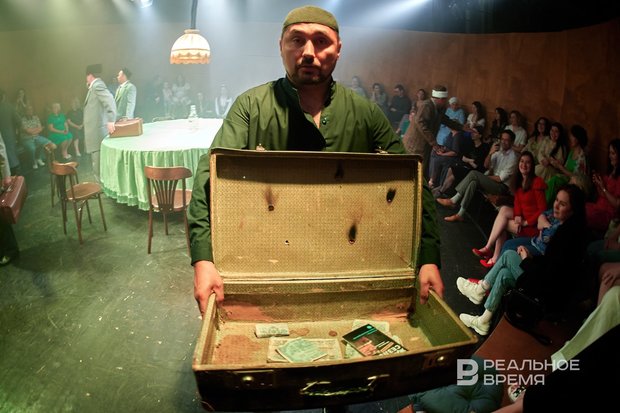 У Имамутдинова спектакль начинается с этой песни, причем с оригинальной записи — живущая на правах воспитанницы Гульнар (Ландыш Ибатуллина) играет, представляя стол, как гигантскую пластинку. Собственно, кроме стола и декораций особо нет. Все пространство схлопнуто в этой цистерне-цирке-амфитеатре. Убрано около трети персонажей. К примеру, нет генерала Носова и купца Наума Пахомича, офицера Сахипгарая (хотя на сайте театра сохранилась информация, что его должен был играть Ренат Шамсутдинов). Так что часть реплик перешли к другим персонажам.