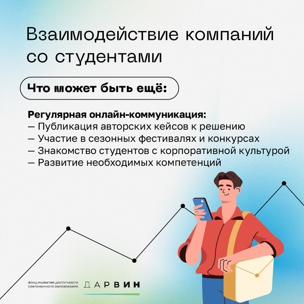 Одним из способов взаимодействия организаций и студентов может стать в том числе регулярная онлайн-коммуникация. Например, мы в Round помогаем наладить такую связь между студентами и компаниями за счет:
