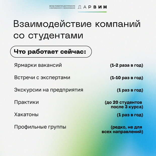 Плавная интеграция в трудовую деятельность и знакомство с компанией со школьной скамьи поможет актуализировать знания и навыки у студентов, а компаниям — более эффективно закрывать кадровые вопросы. Старые форматы работы — ярмарки вакансий, встречи и экскурсии — выполняют свою роль. Но этого сейчас просто недостаточно. Разовые встречи/взаимодействия или короткие практики