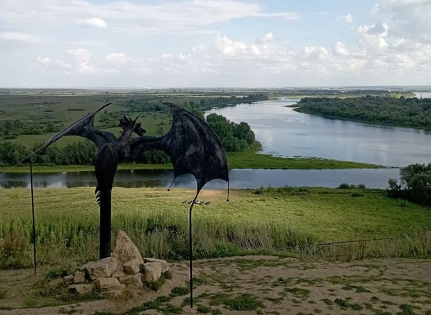 Еще на городище вас встретит металлическая скульптура дракончика, который обнимает крыльями воздух и будто бы готов улететь на речные просторы. А если башни и дракончика вам мало — вас наверняка покорит конная статуя легендарного основателя Елабуги, Ибрагима бен Мухаммада, одного из булгарских правителей.