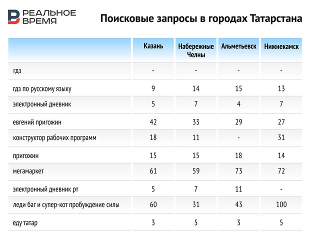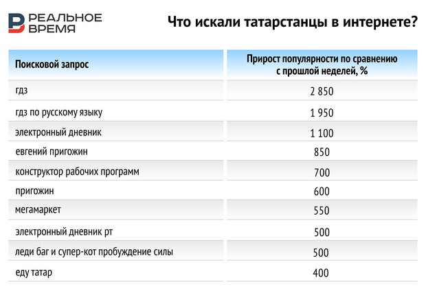 За последние семь дней жители Татарстана чаще всего пытались найти в интернете ГДЗ — готовое домашнее задание. Несмотря на то, что новый учебный год идет всего лишь две недели, школьники уже пытаются упростить свои задачи. Вместе с «домашкой» они также ищут свои электронные дневники, в которых можно узнать оценки и расписание. Кроме школьных забот, граждан по-прежнему волнует и тема гибели главы ЧВК «Вагнер» Евгения Пригожина. Что еще интересует татарстанцев и какие запросы в интернете оказались наиболее популярными — в обзоре аналитической службы «Реального времени».