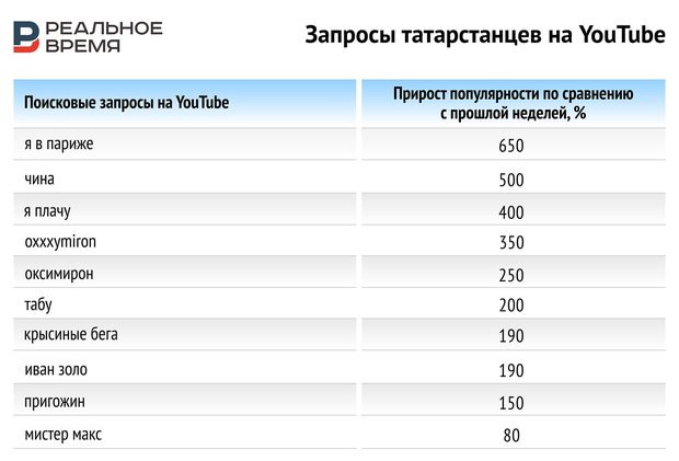 По принципу первой таблицы (ранжированы по приросту популярности или повышению интереса по отношению к прошлому периоду) приводится то, что в тренде у татарстанцев на YouTube: