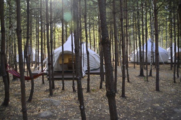 В итоге нашли: В 20 км — Волга, в 15 минутах езды — Архиерейское озеро, вокруг сосновый лес. И туда, и сюда можно добраться на велосипедах, арендованных на месте. Цена демократичная — 200 рублей за час. За временем обещают особо не следить и «лишнего» не брать. Проживание в шатрах трех видов — сафари-тент, белл-тент, лодж-тент.