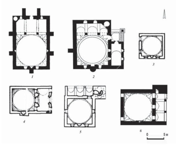 В работах, посвященных архитектуре крымских мечетей, встречается утверждение, что сначала существовали мечети базиличной планировки, а затем стали строиться купольные мечети. Идея эта исходит от О. Шуази, на которого ссылается Б.Н. Засыпкин. Однако далее Б.Н. Засыпкин отмечает, что в разных мусульманских странах существовали различные формы культовых сооружений, и, в частности, в Средней Азии строились купольные мечети, а базиличная планировка для этого региона нехарактерна. Ко времени позднего средневековья достаточно четко выявились регионы со своими строительными традициями и сложившимися типами планировки. Что касается Крыма, то его мусульманская архитектура всегда находилась под значительным влиянием Малой Азии. Если обратиться к более раннему, золотоордынскому периоду, то в это время в Крыму известны как мечети в виде базилик, так и небольшие купольные. К мечетям базиличной планировки относятся мечети «Узбека» и «Бейбарса» в Солхате, а также мечеть на Чуфут-Кале. Все они представляют собой прямоугольные в плане здания, разделенные на три нефа двумя рядами колонн (рис. 1.1-3). В угол зданий с северной стороны встроен цоколь минарета. В мечетях Солхата вход в здание находился в северной стене, на Чуфут-Кале он был сделан в северной части западной стены. Входы были оформлены порталами. В мечети на Чуфут-Кале, возможно, имелся небольшой купол.