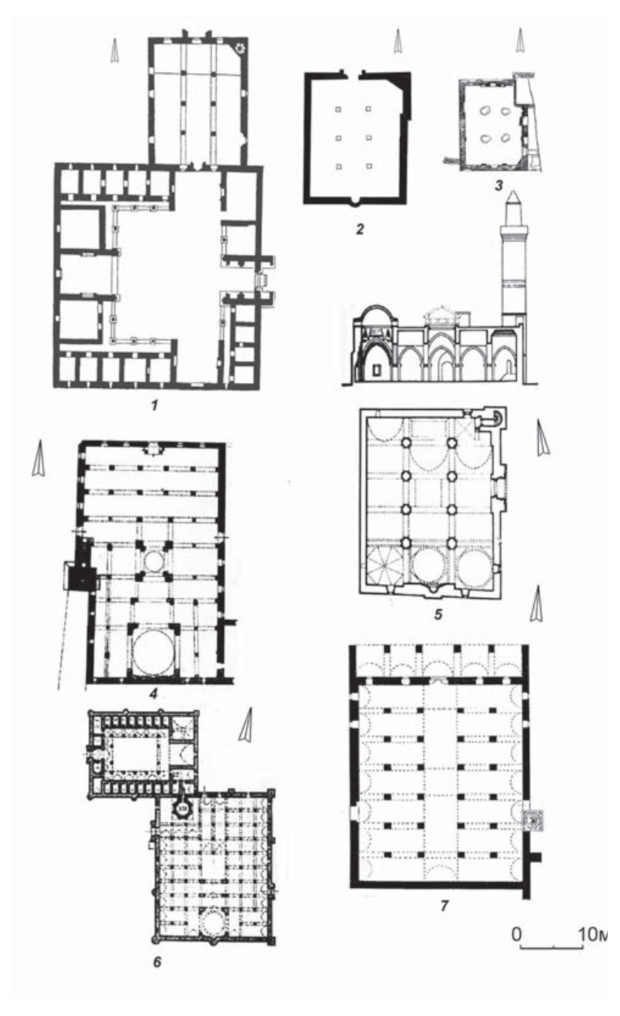 Мечети базиличной планировки возникают в Малой Азии уже в XII в. В качестве примеров можно привести Улу-Джами и Гюлюк-Джами в Кайсери, Улу-Джами в Эрзеруме. Этот тип планировки получает свое развитие в XIII в. В государстве сельджуков Рума, где создаются такие образцы сельджукской архитектуры, как Улу-Джами в Кайсери 1140 г, Ала Алаеддин-Джами в Нигде 1223 г., Улу-Джами в Дивриги 1228-29 гг., Улу-Джами в Малатье 1224 г., Хванд-Хатун-Джами в Кайсери 1238 г. (рис. 1. 4-6) и др. В это время вырабатывается модель официальной сельджукской мечети, отличительными чертами которой являются продольно-базиликальная планировка; акцентирование квадратной в плане михрабной ячейки и перекрытие ее куполом; наличие внутри здания небольшого внутреннего двора или — чаще — открытой световой ячейки в центре интерьера; оформление входа выступающим «сельджукским» порталом. Крымские базиличные мечети имеют более простую планировку: в них отсутствуют купол над михрабной ячейкой и световой проем, но в основе лежит план именно «сельджукской мечети». Такие культовые здания также известны и в Малой Азии, например, Хан-Джами в Кайсери XIII в. (рис. 1.7). К золотоордынскому периоду относятся и две купольные мечети в Крыму. Это Куршун-Джами в Солхате (рис. 2.1-2) и мечеть в Судакской крепости. Планировка их сходна: они состоят из двух помещений — квадратного молельного зала с михрабом, перекрытого куполом на пирамидальных парусах, и северного прямоугольного помещения с перекрытием в виде трех полукруглых в сечении сводов. В Судакской мечети к восточной стене примыкала аркада, состоящая из трех арок. Оба здания имели минареты, встроенные в угол с северной стороны.