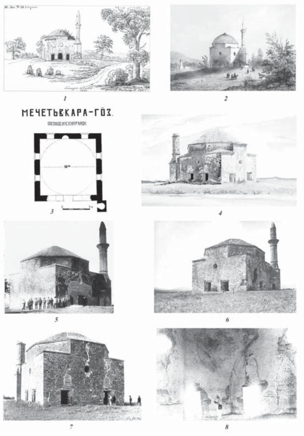 Точно такую же структуру имели несохранившиеся купольные мечети, известные по фотографиям (рис. 4.1-3). Это постройки в селениях Корулу-Кипчак, Каймак Евпаторийского района, Суин-Эли Ленинского района. Мечеть в Каймаке имела пристройку, но основное здание представляло собой куб, переходящий в восьмигранник путем срезания углов. На двух видах Феодосии, выполненных К.Ф. Кюгельхеном, видна мечеть Кишла-Джами такой же архитектоники (рис. 4.4-5). С 1811 по 1871 гг. в этом здании располагался Феодосийский музей древностей. Уже в виде музея она была зарисована Дюбуа де Монпере (рис. 4.6). Мечеть имела один вход с северной стороны. Окна располагались в два яруса: нижние были прямоугольной формы, верхние — арочные. На рисунках Кюгельхена у северо-восточного угла мечети изображен минарет с граненым стволом, шерефе и граненой башенкой с шатровой крышей, увенчанной алемом. По мнению С.Г. Бочарова здание имело размеры 8,5 х 8,5 м, а прямоугольный цоколь минарета — 2,4 х 2,2 м. Другой вариант пространственного оформления однокупольной мечети — это когда диаметр барабана купола меньше размеров кубического основания, и барабан как бы поставлен на него сверху. Типичным примером такой архитектурной формы является постройка в селении Колеч-Мечеть (Новопокровка) недалеко от Феодосии. Эту мечеть упоминает в своих записках Эвлия Челеби. Он описывает деревню Коледж, или Колеч, следующим образом: «Там двести татарских домов, соборная мечеть с высоким куполом и каменным минаретом, баня и строения, крытые свинцом». В настоящее время мечеть не сохранилась и известна только по фотографиям 20-х гг. XX в., описанию Б.Н. Засыпкина и плану, составленному архитектором.