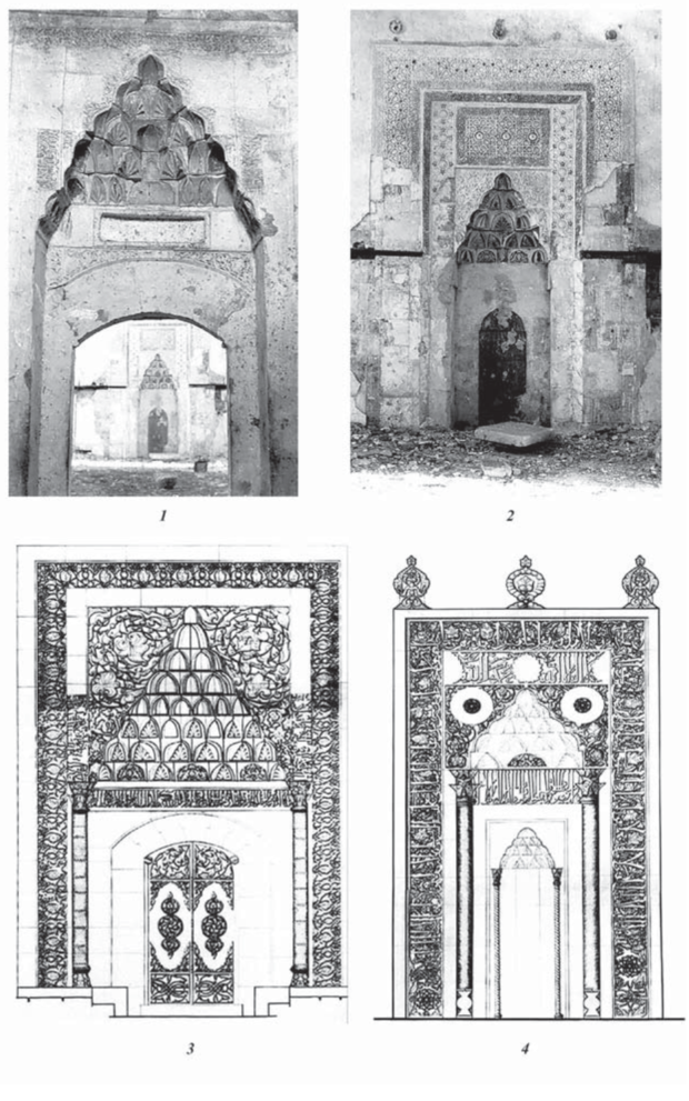 Стены здания сложены из хорошо обработанных каменных блоков. Здание квадратное в плане со сторонами примерно 14,2 х 14,2 м (рис. 5.1). На нижний кубический объем поставлена высокая восьмигранная призма, которую венчает уплощенный восьмигранный шатровый купол (рис. 5.2-6). Купол был выстлан каменными плитами, в зените его находилось навершие (кубба) из двух шаров, насаженных на стержень. Во всех четырех стенах сделаны окна, расположенные в два яруса. Нижние окна прямоугольной формы расположены низко, почти на уровне земли. Снаружи оконные проемы обрамлены узким выступающим бордюром, который образует над ними стрельчатую арку. Люнеты над окнами украшены резьбой. Окна второго яруса расположены высоко, почти под крышей. Два окна имеют стрельчатую форму, между ними расположено круглое. Вход в мечеть находился с северной стороны и был украшен резьбой (рис. 6.1). Сведения о нем сохранились в описании Б.Н. Засыпкина: «Дверной пролет перекрыт мусульманской перемычкой (плоской аркой. — Э. 3.), расположенной в нише, верх которой увенчивается ячеистым полукуполом с арабесками. Тимпан был заполнен растительным орнаментом и заключается в прямоугольную раму из растительного орнамента». Следует добавить, что над дверным проемом и ячеистой конхой находилось прямоугольное углубление, в котором, вероятно, находился тарих. Это декоративное оформление напоминает вход в мечеть «Узбека» в Солхате (рис. 6.3).
