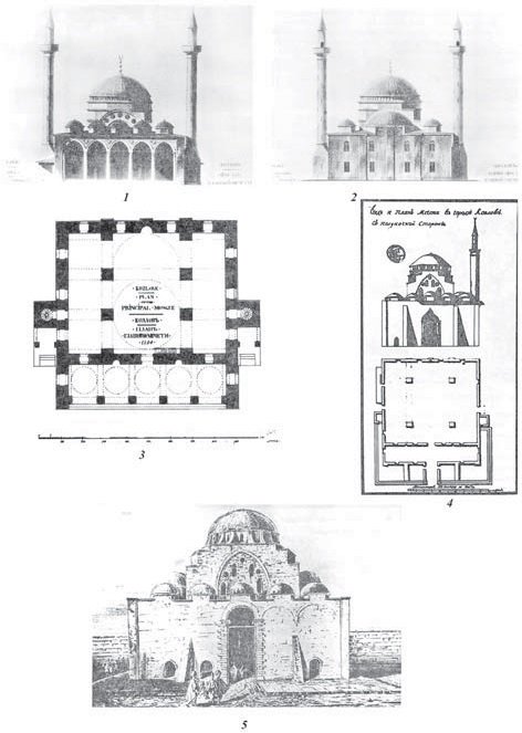 П.С. Паллас, посетивший Феодосию в 1794 г., когда мечеть еще не была перестроена, также оставил ее описание: «…большая, построенная с благородной простотой, прекрасная, еще порядочно сохранившаяся главная мечеть, называемая Биюк-Джами. Она имеет семнадцать саженей (36 м) в длину и четырнадцать (30 м) в ширину. Главный ее купол более девяти саженей в поперечнике (19 м), и с трех сторон она еще имеет одиннадцать маленьких куполов. Два минарета вышиной в шестнадцать саженей (34 м) с витой лестницей до самого верха еще существовали, когда я поручил нарисовать вид Кафы со стороны бухты, но затем они были разрушены. Около этой мечети находится большая турецкая баня с двумя сводчатыми помещениями». Судя по этому описанию, кроме большого центрального купола в здании было пять малых куполов, перекрывающих портик и по три купола над боковыми нефами. Но это явная ошибка, которая потом была повторена Дюбуа де Монпере, заставшего мечеть в полуразобранном состоянии, скорее всего, вообще без куполов. На чертеже В. Гесте (рис. 17), снявшего план здания в 1798 г., купола над боковыми нефами почему-то вообще не изображены. Однако, судя по плану, очевидно, что боковые нефы могут быть перекрыты только двумя куполами, следовательно, куполов (вместе с большим) всего одиннадцать, а малых десять. О десяти малых куполах пишет и П.И. Сумароков, который был в Феодосии в 1799 г.
