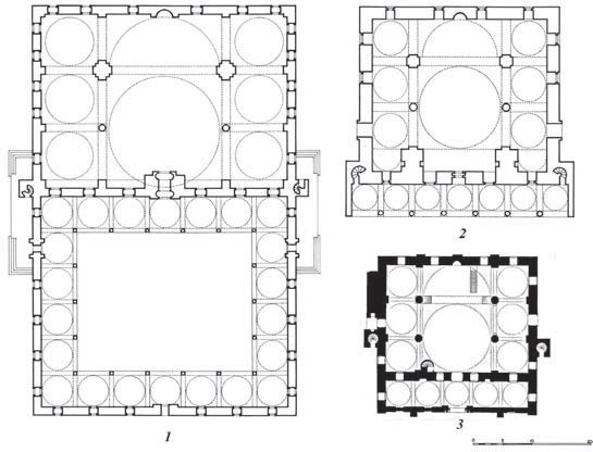 Франсиско де Миранда назвал мечеть султана Селима «далекой от совершенства имитацией наиболее крупных мечетей Константинополя». Однако она имеет довольно точные аналогии среди турецких мечетей, правда, вне Константинополя. Практически идентична ей по плану Султан-Джами в Манисе 1522 г. Манисская мечеть также имеет трехнефный зал, центральная часть которого перекрыта большим куполом, а боковые нефы двумя маленькими. Предваряет его портик, перекрытый пятью куполами (рис. 20.2-4). Сходную планировку имеют мечеть Чешнигир 1474 г. и Хатуние 1479 г. в Манисе.