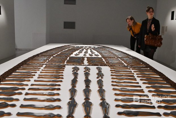 О том, что эмиграция — дело зачастую подневольное, напоминает одна из центральных инсталляций выставки: Антонио Сидибе в «Бесконечной реке» нарисовал кофейными зернами силуэт корабля, который населил печеньем в виде человеческих силуэтов. Окружают ее работы на тему апроприации, вроде печально знаменитого «блэкфейса», который до сих пор используют татарстанские театры. «Бесконечную реку» назвала ключевой работой министр культуры РТ Ирада Аюпова.