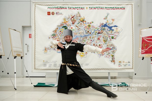 На первом этаже большой популярностью пользовались две вышитые карты республики: каждый находил свой район и фотографировался рядом с ним. Здесь же были 45 полотенец, помеченные надписями «Реплика»: мастера воспроизводили технику вышивки гладью и тамбурной вышивки. В одной из секций наверху главный научный сотрудник Института истории Гузель Валеева-Сулейманова рассказывала, как устроено смысловое наполнение этой карты, а также вспоминала, как на многие годы в Татарстане забыли тамбурную вышивку: в «Азат хатын» печатали, как вышивать крестиком и гладью.
