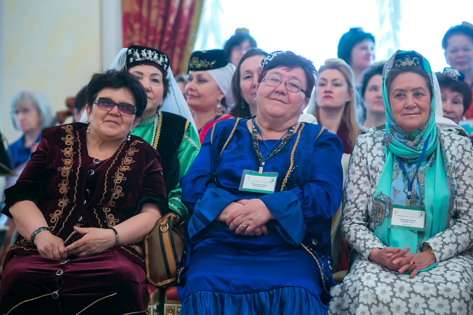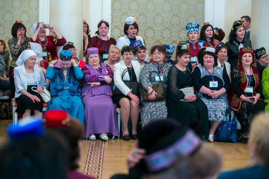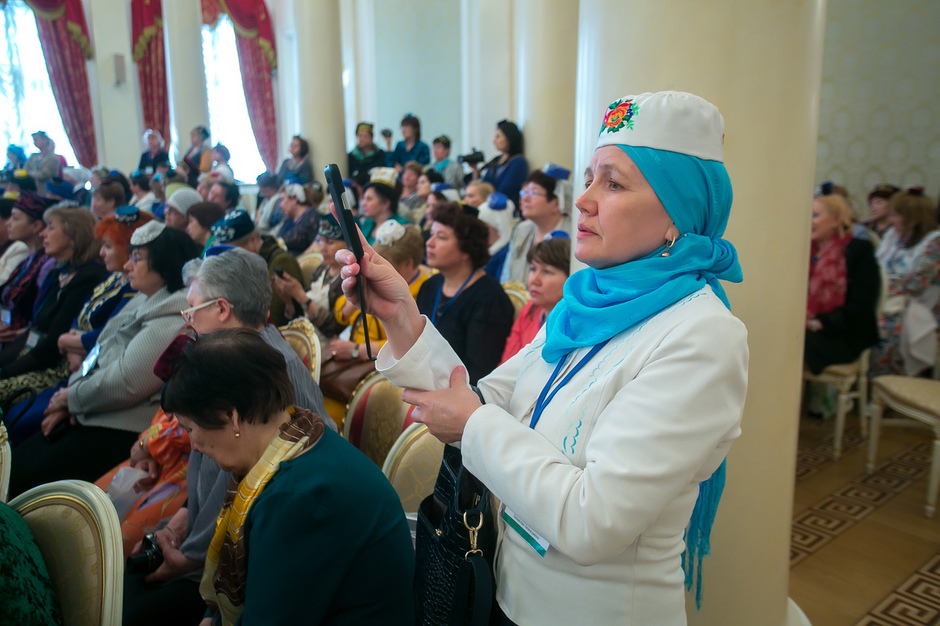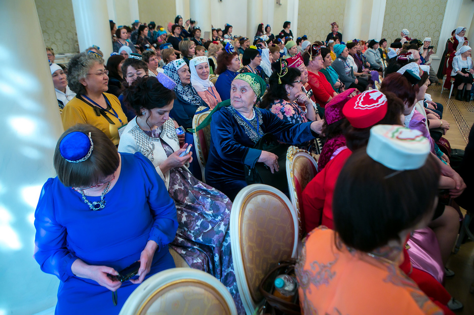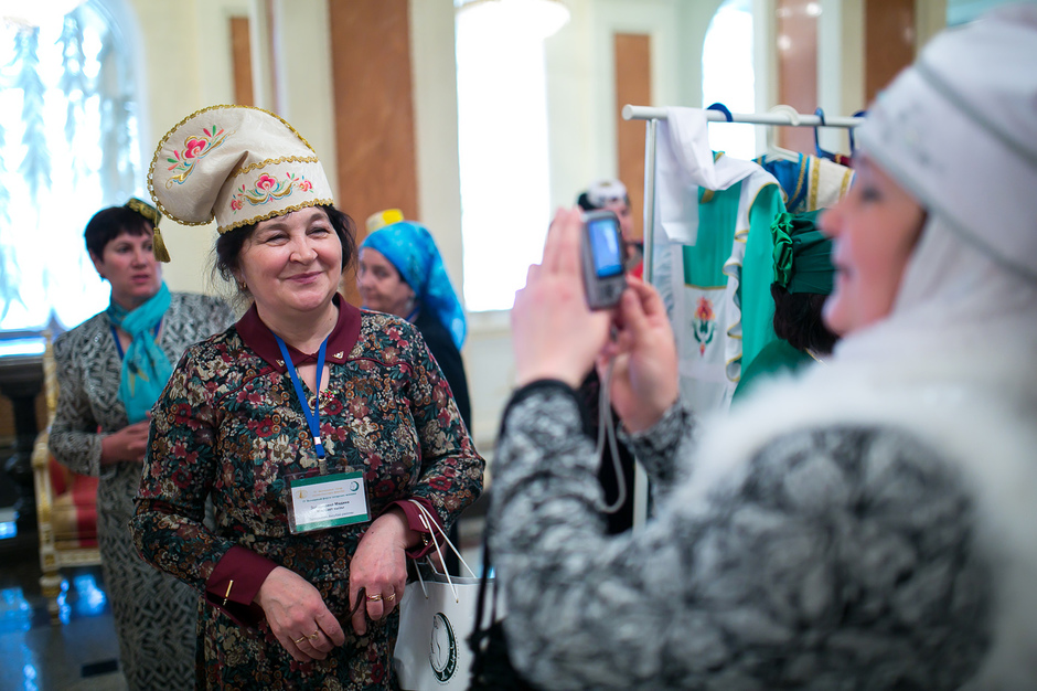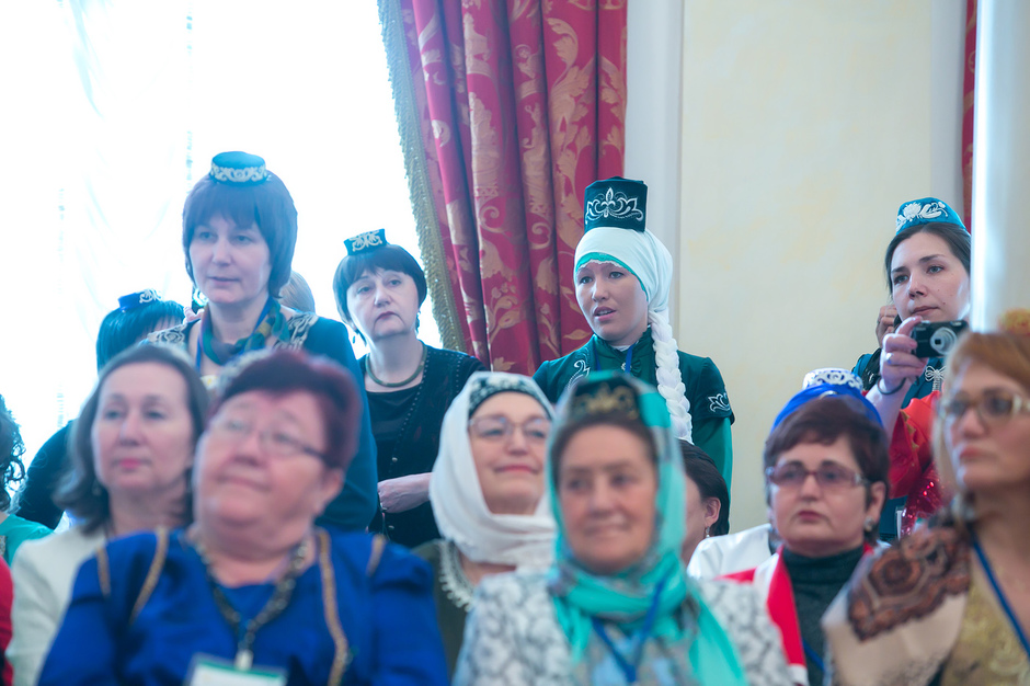 У входа в театр имени Тинчурина, где утром прошло пленарное заседание, никто наличие головных уборов не контролировал — по большому счету не было даже регистрации участников. Тем не менее, увидеть участницу, голову которой не украшал бы калфак, было практически невозможно. Для тех, кто вопреки строгому наказу пришел неподготовленным, организаторы заботливо подготовили специальные наборы, в которых кроме буклетов оказались и небольшие бархатные калфаки с золотистой вышивкой.