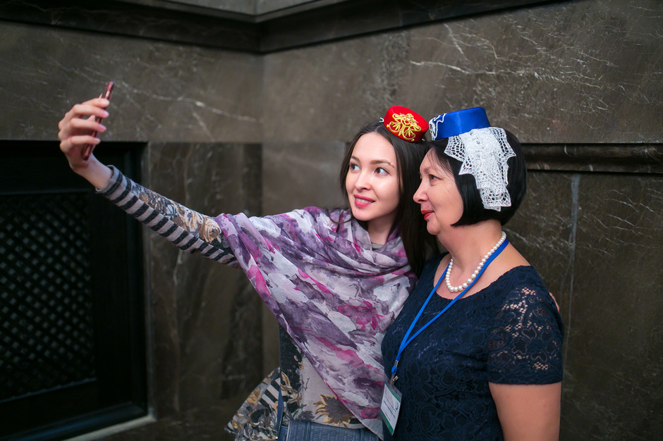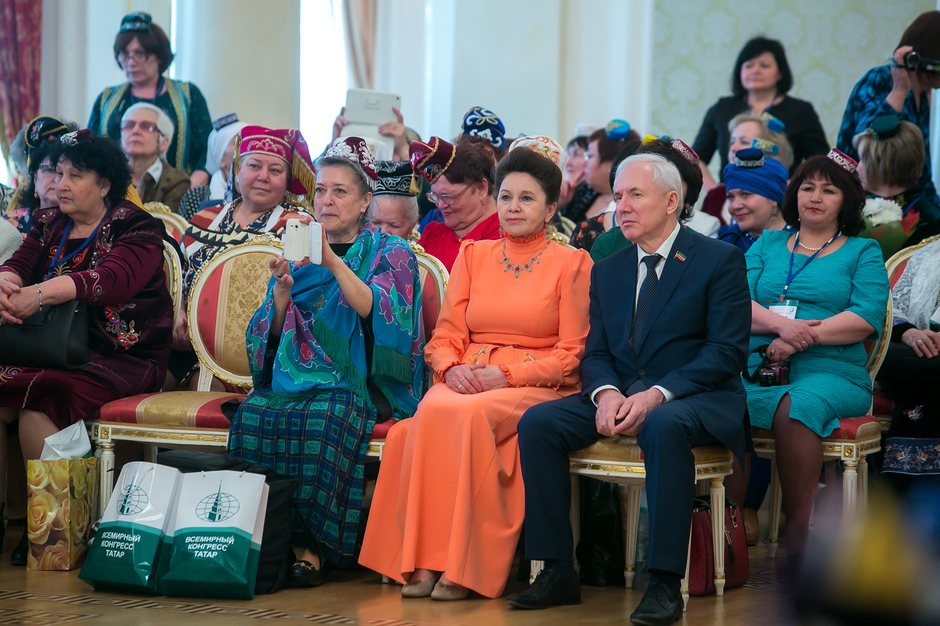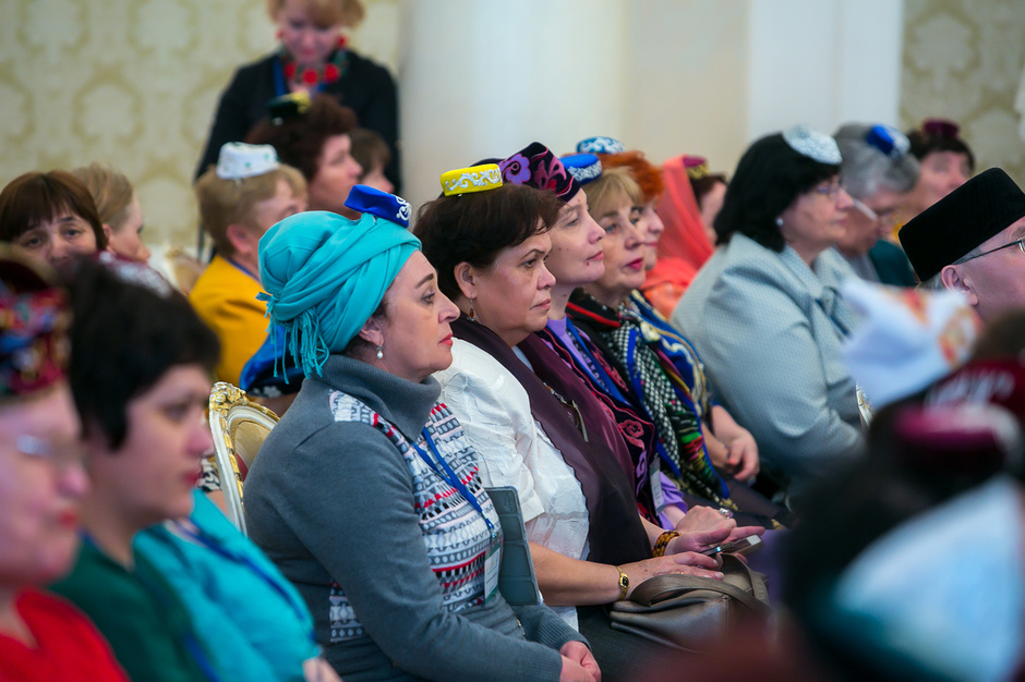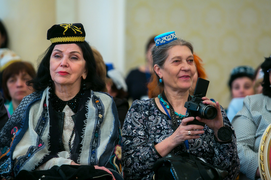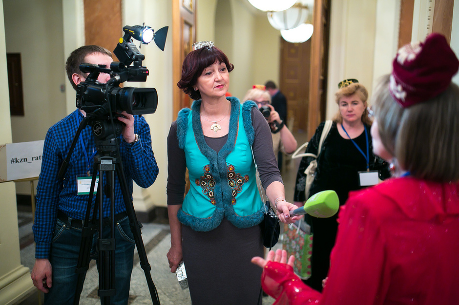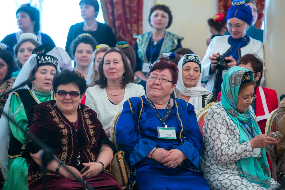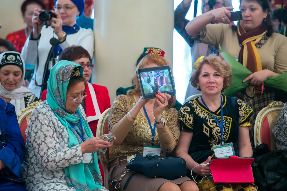 У входа в театр имени Тинчурина, где утром прошло пленарное заседание, никто наличие головных уборов не контролировал — по большому счету не было даже регистрации участников. Тем не менее, увидеть участницу, голову которой не украшал бы калфак, было практически невозможно. Для тех, кто вопреки строгому наказу пришел неподготовленным, организаторы заботливо подготовили специальные наборы, в которых кроме буклетов оказались и небольшие бархатные калфаки с золотистой вышивкой.