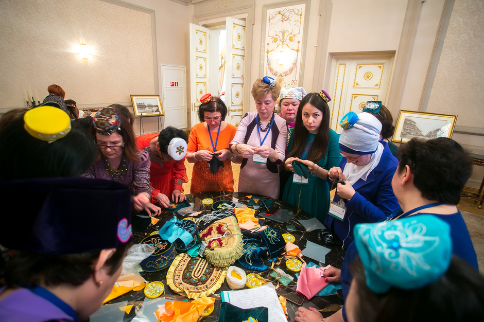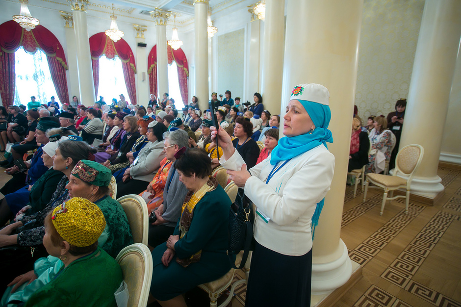 Далее представительницы из Москвы, Санкт-Петербурга, Омской, Кемеровской областей, Казахстана, Турции и Китая рассказывали, какой вклад они вносят в сохранение традиций: вышивают калфаки, тюбетейки, изю, готовят кыстыбый и треугольники, учат национальные песни и танцы. Многим участницам, прибывшим из зарубежья, было трудно говорить на «казанском» татарском, тем не менее, было видно, как они рады своим успехам.