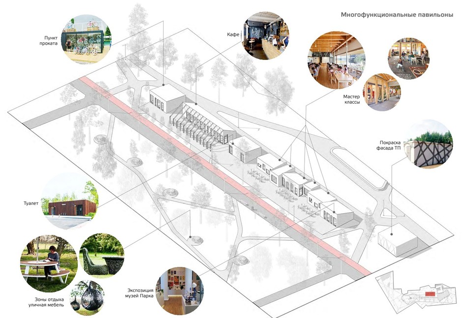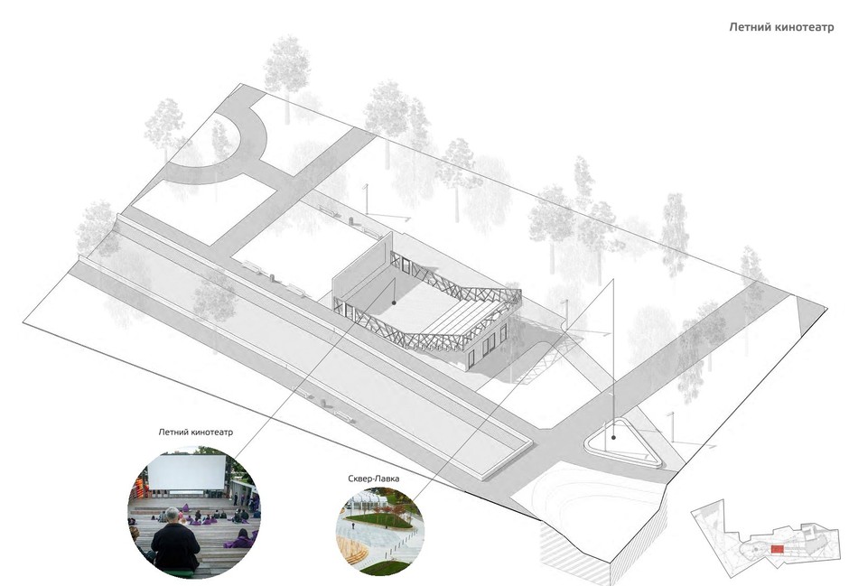 Отдавая дань памяти бывшему когда-то почти в центре парка кинотеатру в самолете «Антошка», архитекторы предложили разместить там летний кинотеатр. Рядом с ним будет располагаться детская зона для детей от 7 до 12 лет.
