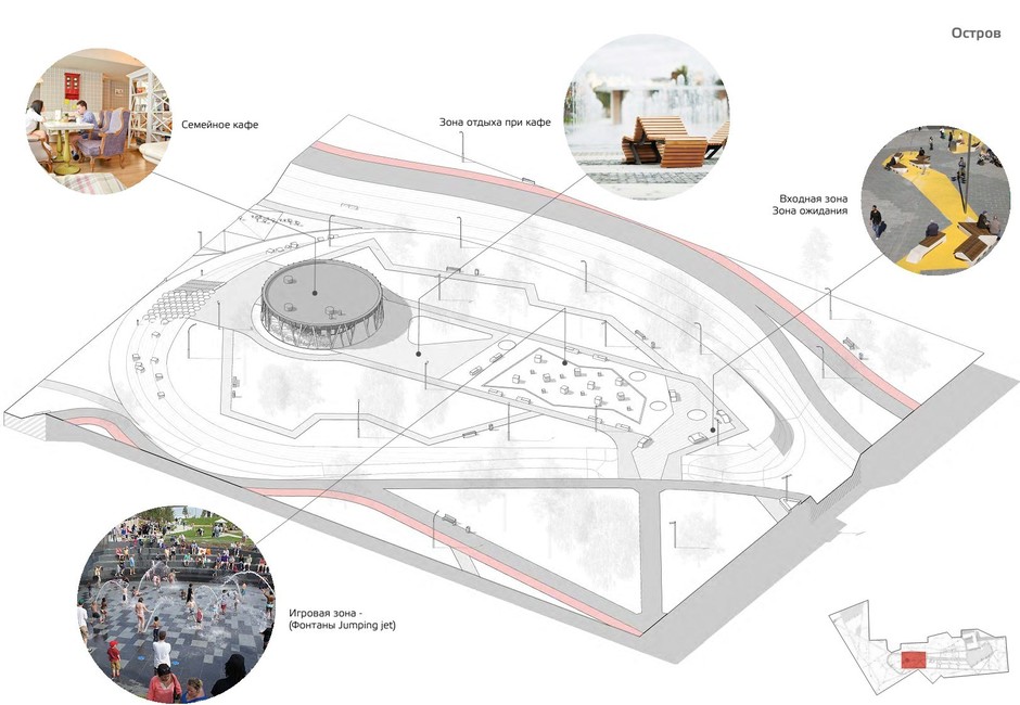 На острове предлагают сделать фонтаны и семейное кафе. В нише за островом архитекторы решили засыпать рвы, посадить плотный газон и сделать лестницы-скамьи. Уже внизу предлагают сделать сразу три зоны — экстрим-парк, детскую спортплощадку для детей старше 12 лет и многофункциональную площадь.