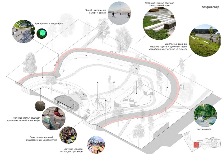 За амфитеатром, как и планировалось, местным жителям предложили разместить спортивные площадки — восемь стритбольных, а между строящимися волейбольной и для мини-футбола сделать зону для воркаута.