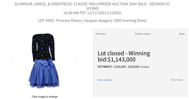 Это рекордная сумма для нарядов принцессы Дианы. До этого самым дорогим считалось платье от британского дизайнера Виктора Эдельштейна, которое вошло в его коллекцию 1989 года. Оно было продано в конце января этого года за 604,8 тыс. долларов.