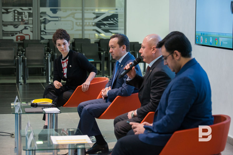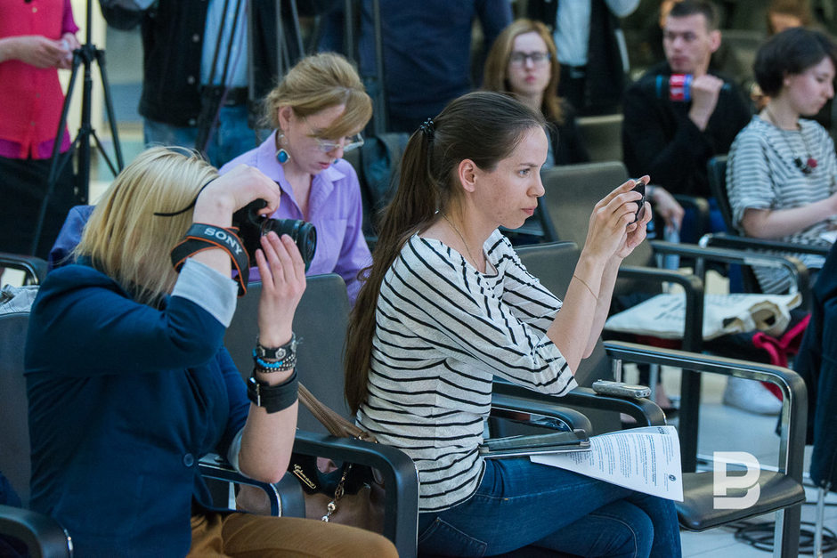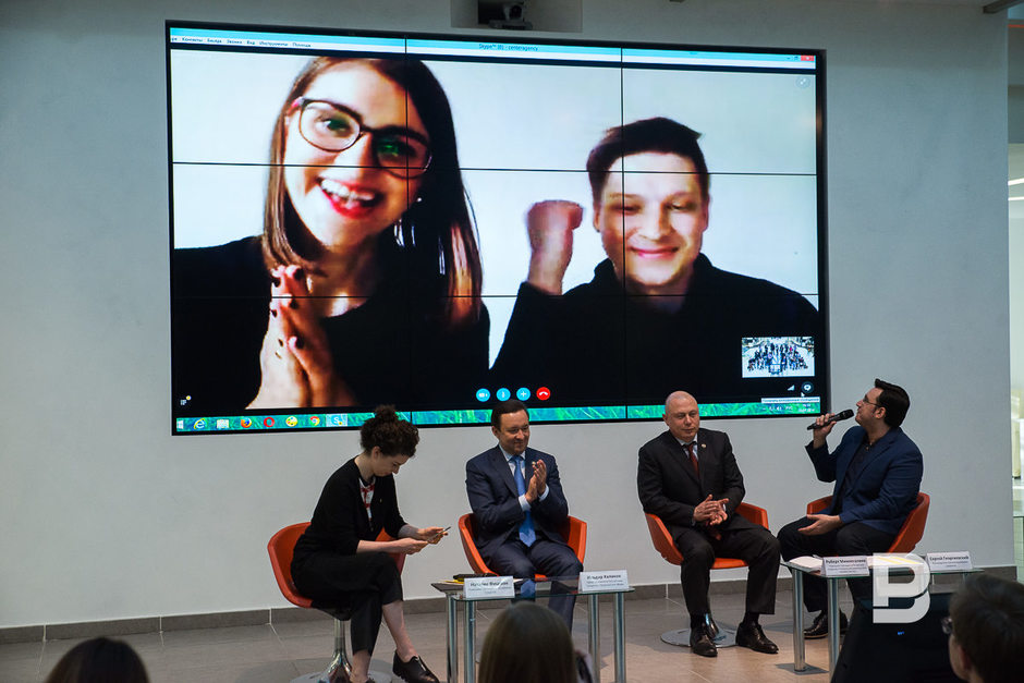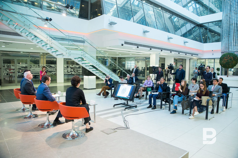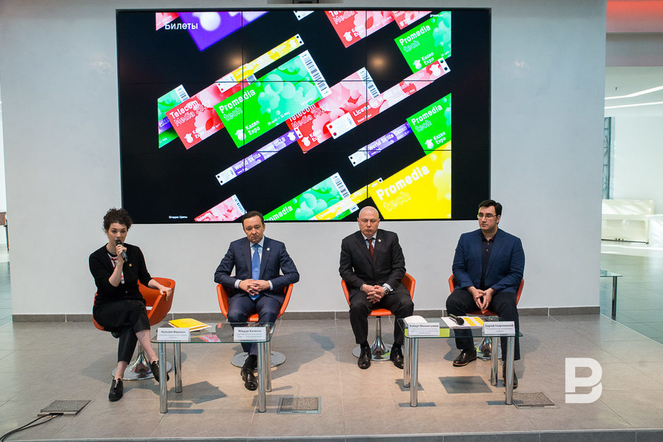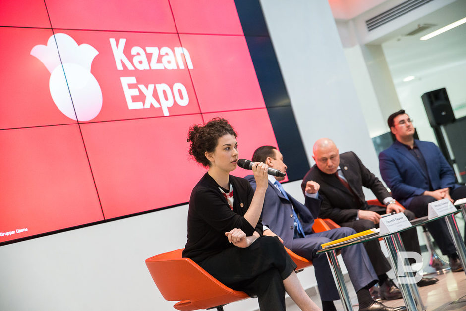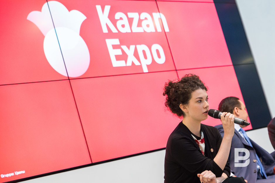 Членам команды Gruppa Дарье Аникеевой и Кириллу Борисову об их победе сообщили прямо во время пресс-конференции с помощью программы Skype. Аникеева поведала, что Gruppa открылась всего 3 месяца назад и что разработка логотипа для «Казань Экспо» — их первый серьезный проект. «Мы выбрали цветы, потому что цветы — это символы Татарстана, как нам кажется. Мы переосмысливали орнаменты», — рассказала Аникеева.