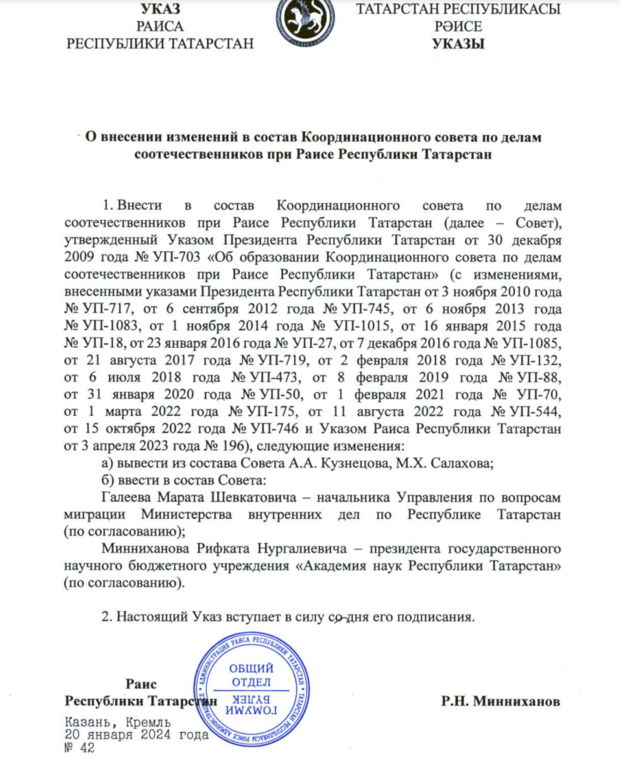 - В составе Координационного совета по делам соотечественников при раисе Татарстана произошли изменения. Так, в состав совета вошли начальник Управления по вопросам миграции МВД по Татарстану Марат Галеев и президент Академии наук республики Рифкат Минниханов.