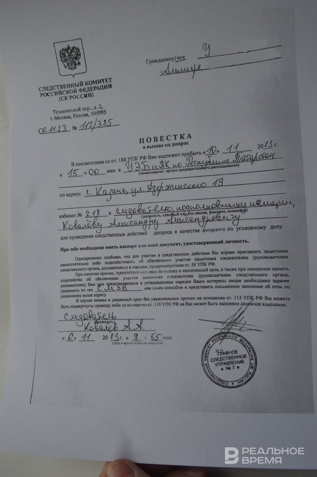 Альмире скинули повестку из «Следкома», в которой сообщали, что она участвует в «следственном действии». realnoevremya.ru/Василя Ширшова