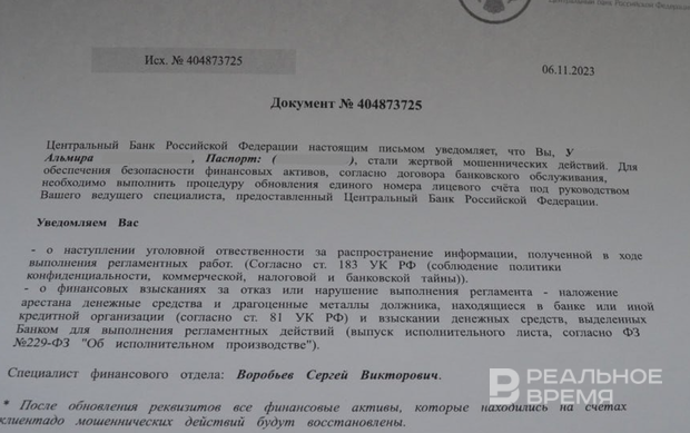 Прислал бумагу, похожую на бланк регулятора, где «ЦБ» так и сообщал: «Вы, У… Альмира …, стали жертвой мошеннических действий». realnoevremya.ru/ Василя Ширшова