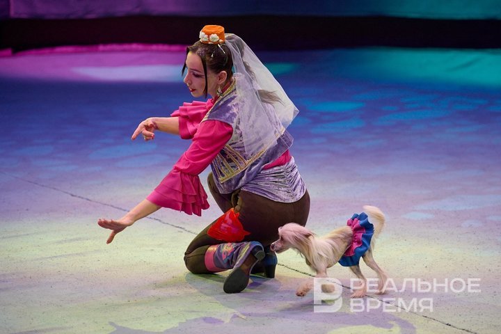Номера в спектакле и местные, и привозные, но все они привязаны к стихам Тукая. Мария Анисимова с дрессированными собаками — это история пса Акбая, которого пытается приручить автор. Все цирковые артисты наряжены в специальные костюмы с татарскими орнаментами. Анисимовой особенно идет калфак.