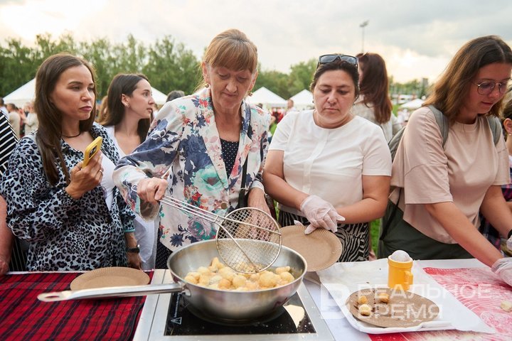 На другой стороне поляны устраивались мастер-классы. Наибольшей популярностью пользовалось изготовление творожных шариков Альбины Фасхеевой — к этому столу первым делом и повели и дорогих гостей на угощение.