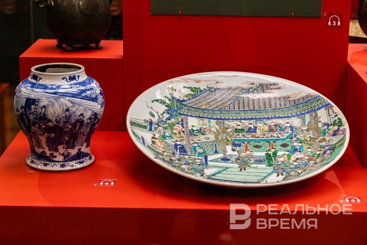 Но не только фарфор имел значение в этих ритуалах. Большое белое блюдо с яркими росписями выделяется на фоне других экспонатов. В отличие от первого, это — экспортный товар, созданный для европейских ценителей. На его поверхности сцена, на которой изображены китайские чиновники, они беседуют и ведут переговоры. «Сюжет рассказывает историю о взаимоотношениях правителя со своими сотрудниками», — объясняет Петров. Сложная, детализированная работа фарфоровых дел мастеров точно попадала в европейский вкус, который жаждал экзотики и китайской изысканности.