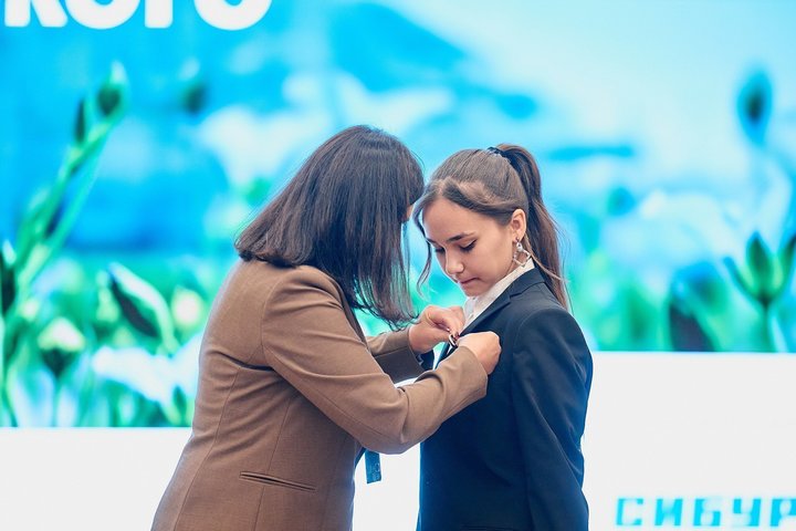 Сегодня первый шаг в этом направлении сделали и ученики 10 «В» класса. Им прикрепили к школьной форме значки с логотипом компании — теперь это их отличительный знак на ближайшие два года, означающий, что ребята выбрали для себя реализацию в области химической промышленности.
