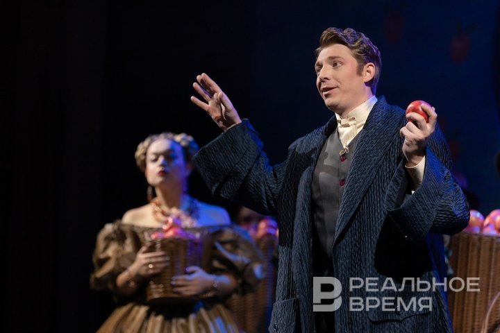 Патраков выстроил на сцене добродушную, лубочную картину — с мобильной гигантской рамкой, облаками и яблочными деревьями. Тут же громоздятся корзины с яблоками, а цыгане-музыканты — техники сцены то и дело вытаскивают коня — в яблоках.