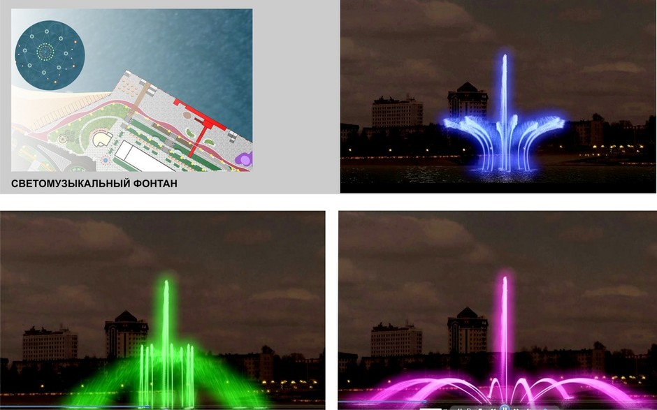 «Фишкой» всего проекта, как подчеркнул в интервью «Реальному времени» Фирдавис Ханов, станет светомузыкальный фонтан. Причем соорудят его прямо в реке Каме, недалеко от берега. Надводный диаметр чаши составит 40 метров, подводный — 60. Самая высокая его струя будет «выстреливать» на высоту в 50 метров, а другие струи — образовывать в такт музыке различные фигурные элементы.