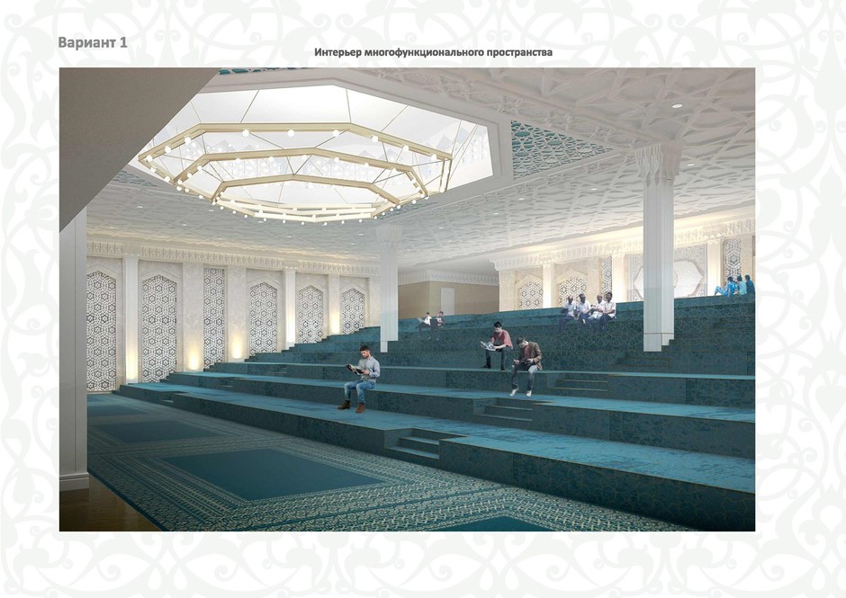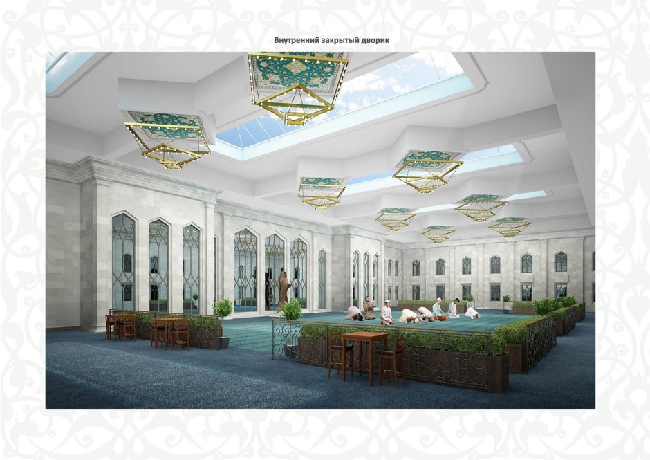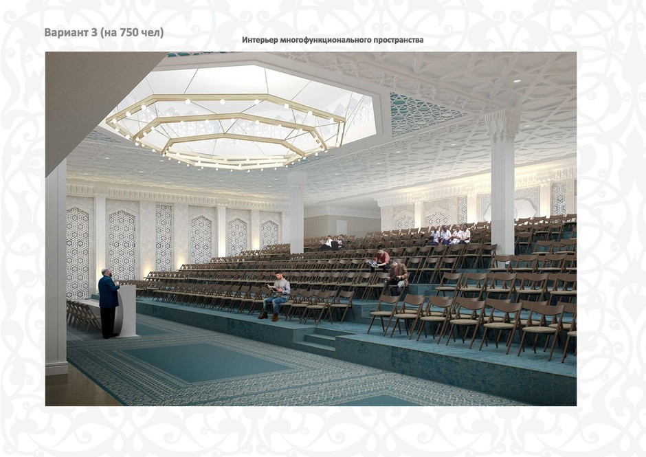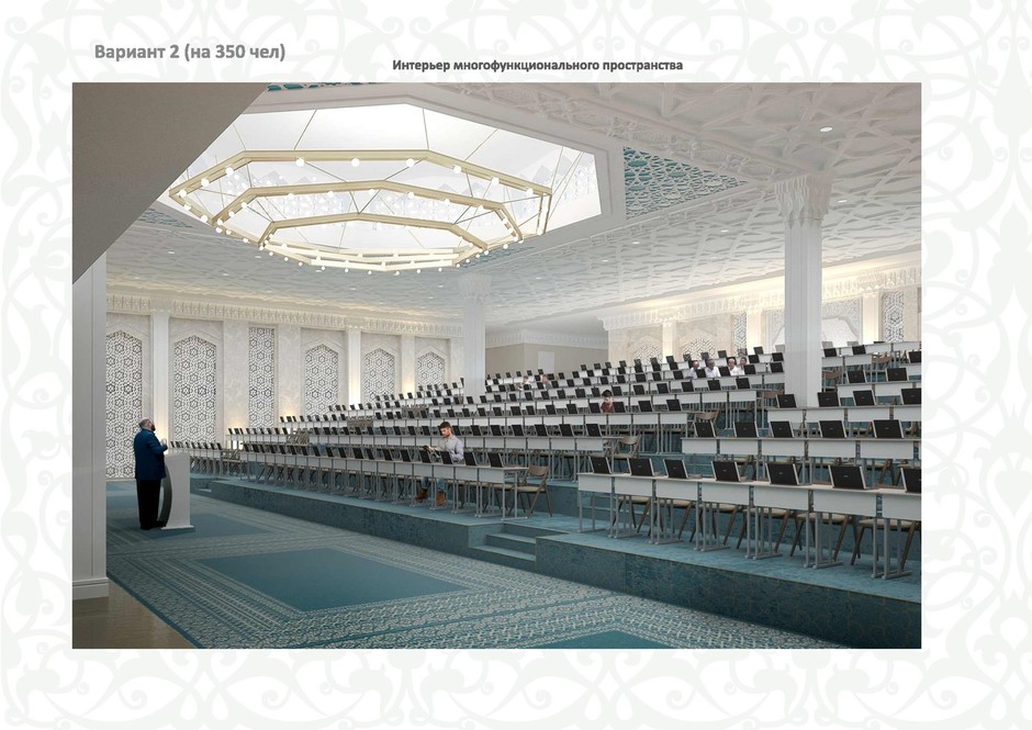 «Центром и смысловым ядром» здания, по его словам, должен стать зал-амфитеатр. Такая форма размещения большого количества людей считается оптимальной еще со времен античности, подчеркнул проектировщик. Амфитеатр сможет вмещать от 350 до 750 человек — там будут проводиться мероприятия, совещания, пресс-конференции. Пространство под амфитеатром планируется использовать в качестве хранилища для библиотеки, которое сможет вместить до 80 тысяч единиц. Окнами библиотека будет выходить во внутренний дворик площадью порядка 1000 кв. м. Это пространство будет использоваться для чтения намаза, также студенты смогут общаться здесь в свободное время. Пятничные праздничные намазы будут проходить в находящейся неподалеку Белой мечети.
