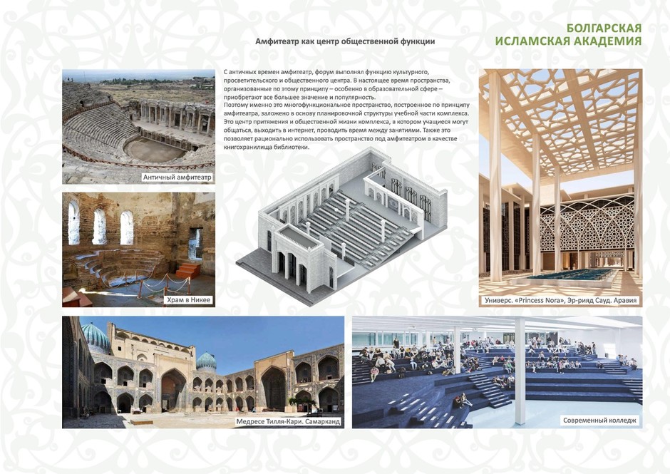 — Архитектурный облик академии формировался как собирательный образ медресе и включает в себя все основные элементы здания с подобной типологией. Фактически планировочная структура повторяет классическое медресе с прямоугольным планом и внутренним прямоугольным двориком, и помещениями, расположенными по периметру, — так Хуснутдинов комментировал очередной слайд.