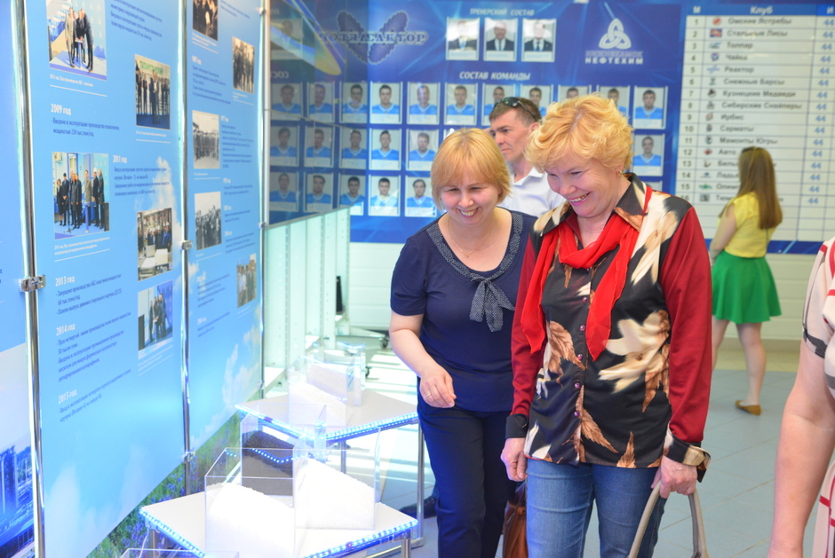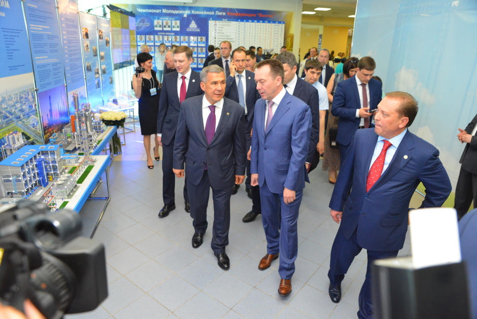 Кстати, последние инновационные разработки и достижения нефтехимии Татарстана в фойе ледового дворца демонстрировала специализированная выставка. Рустам Минниханов посетил каждый стенд, поинтересовался новинками и по традиции сделал селфи с участниками выставки.