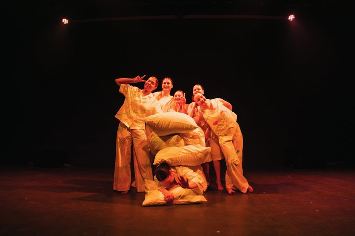 Актрисы двигаются. То замыкаются в индивидуальном танце, то превращаются в кей-поп-группу BTS, то начинают бороться поролоновыми палками. Это очень чувственные движения — радость-растерянность-страх. Половина девушек — слышащие. Еще две — слабослышащие. Одна не слышит совсем. Это можно понять, когда актрисы играют в «сломанный телефон».