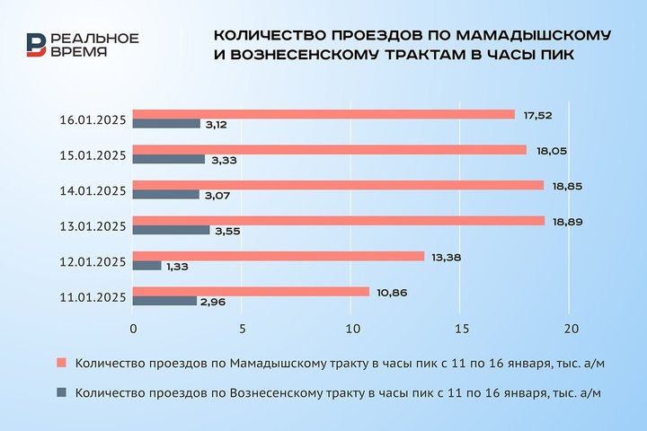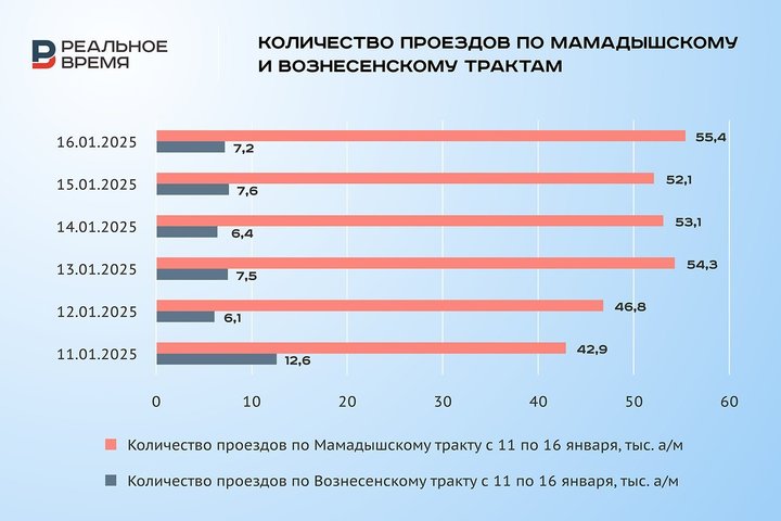 При этом, как следует из информации, которую ранее в Казани публиковали со ссылкой на концессионера, суточный трафик на Вознесенском тракте на другой день после введения платы за проезд упал вдвое — с 12,6 тысячи автомобилей до 6 тысяч, а затем слегка увеличился и застыл на уровне 7,2—7,5 тысячи. Одновременно трафик на бесплатном Мамадышском тракте в это время заметно вырос — с 42,9 тысячи до 55,4 тысячи проездов. В часы пик, когда стоимость проезда достигала максимума, трафик на платной дороге падал до 3—3,5 тысячи, а на Мамадышском увеличивался до 18—18,9 тысячи.
