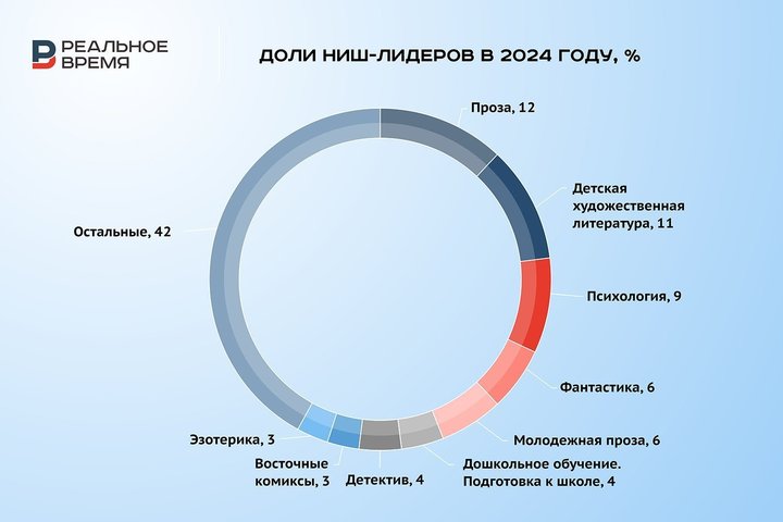 Татьяна Горская представила довольно специфические данные по нишам книжного рынка. Если обычно книги делят по категориям: художественная литература, нон-фикшен, детская и комиксы, то Горская дала статистику по еще более узким сегментам, выделив девять направлений. По ее данным, доля прозы на книжном рынке в 2024 году выросла на 18%, ее продажи составили 11,6 млрд рублей против 9,9 млрд рублей в 2023 году.