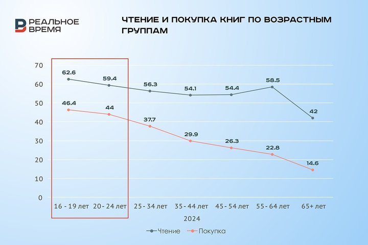 Что касается возрастной группы, то здесь лидером уже несколько лет подряд остается молодежь. Один из самых высоких показателей чтения у людей в возрасте 16—19 лет, 20—24 года и 55—64 года. «Видимо, скорость жизни позволяет людям в возрасте 55+ читать то, что не успели прочитать в предыдущие годы. Они, конечно же, выбирают несколько иную литературу, чем читающая молодежь», — добавила Горская.
