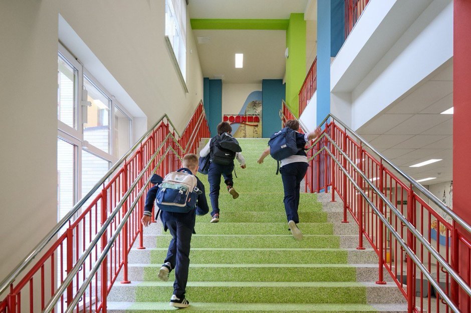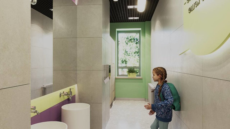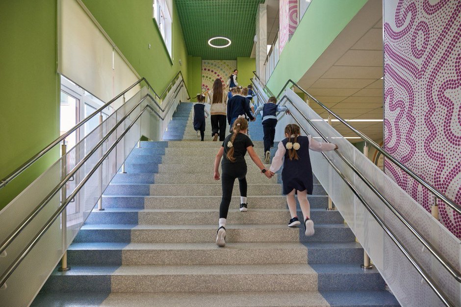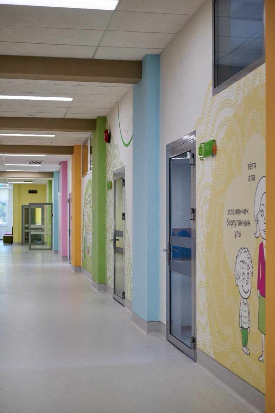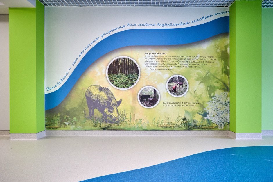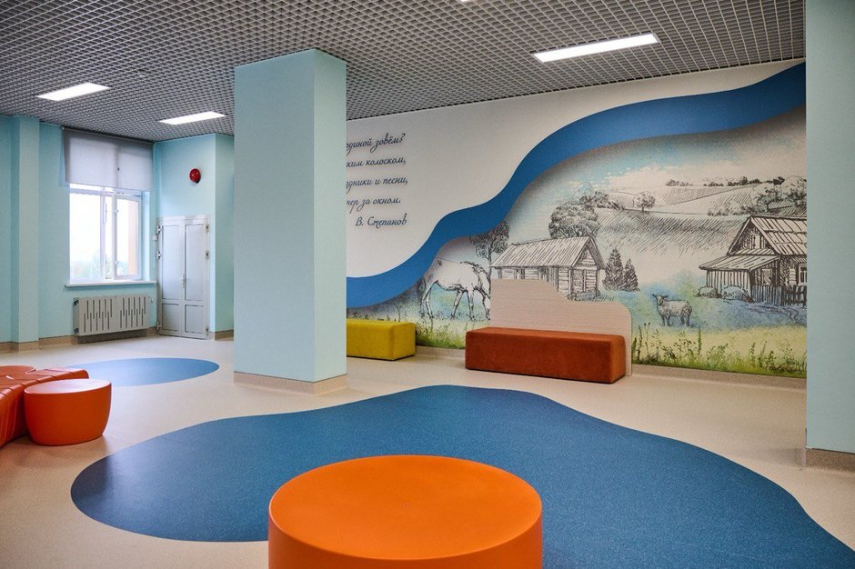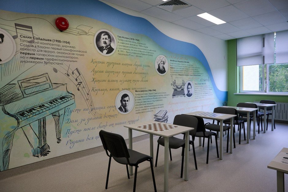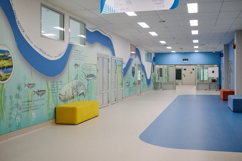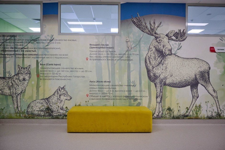 Четыре наши школы были удостоены наград, из них две типовые по смыслу, но такие разные по содержанию. Одна из них — это школа «Родина», которая находится на одноименной улице. В оформлении интерьеров здесь мы использовали в графике русло реки, которое «протекает» по всем общественным пространствам школы и трактуется нами как информационное поле. В зависимости от расположения на стенах школы вы увидите информацию о всех реках Татарстана с указанием их географического положения, о всех рыбах, которые в них водятся, о всех растениях, которыми мы богаты, животных и птицах, которые населяют республику, ну и так далее… Практически энциклопедический объем информации упакован нами в понятную и стильную форму — сочетание акварельных разводов и графики.