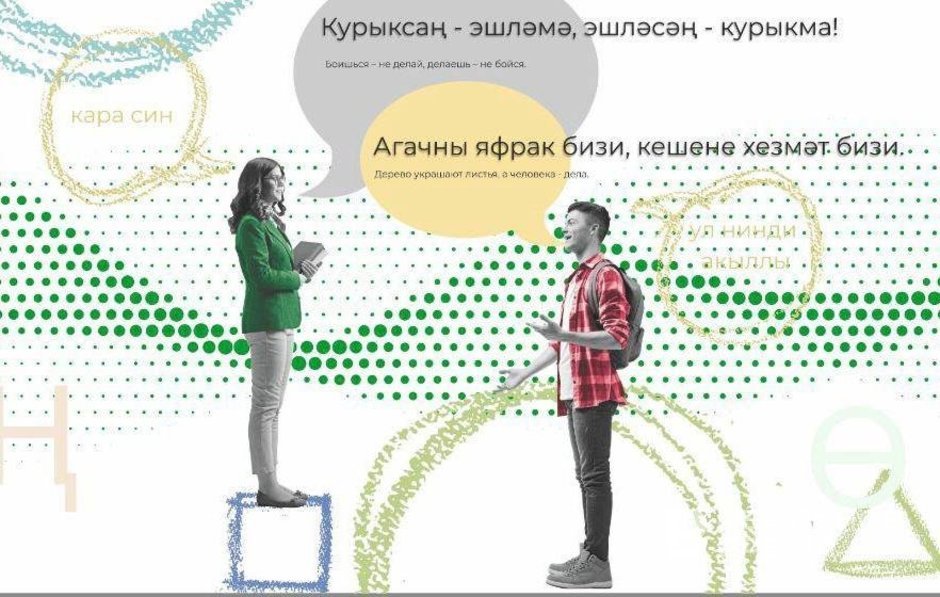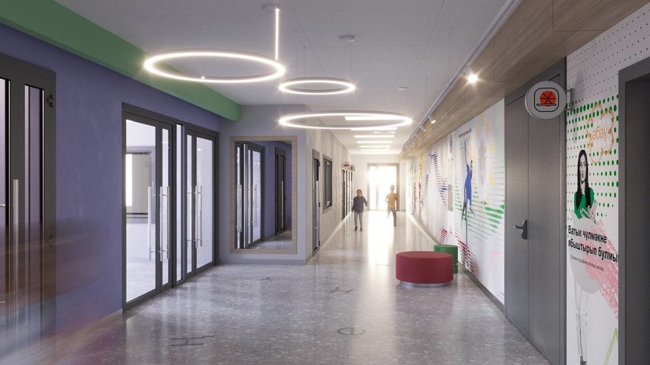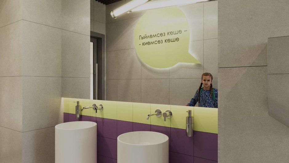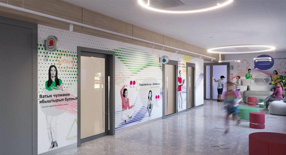 Третья школа — школа наставничества, здесь обучение идет на татарском языке. В связи с этими основными данными я выделила: татарский язык и его особенности — это уникальные буквы; отметила понятие наставничества: наши первые наставники — это наши родители, а их наставники — их родители и так далее, то есть наставники — это наши предки. Предки — это народ и его мудрость. Мудрость народа всегда в устойчивых выражениях, передаваемых из поколения в поколение — это пословицы и поговорки. Кроме того, ассоциации с татарами такие — это очень мудрый народ, динамичный с чувством юмора. Все это легло в основу концепта. В графике соединили динамичный фон и изображения подростков и учителей, которые в шутливой манере «произносят» татарские пословицы, а еще реагируют на них характерными татарскими междометиями типа «абау!». Дети здесь будут учиться, но все-таки они дети и именно в этой школе мы оставили рекреацию без поучений, здесь дети отдыхают и улыбаются, глядя на стены, а заодно и запоминают мудрые татарские пословицы. Получилось свежо, позитивно и легко, но при этом не потеряло глубокого смысла.