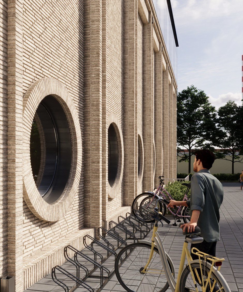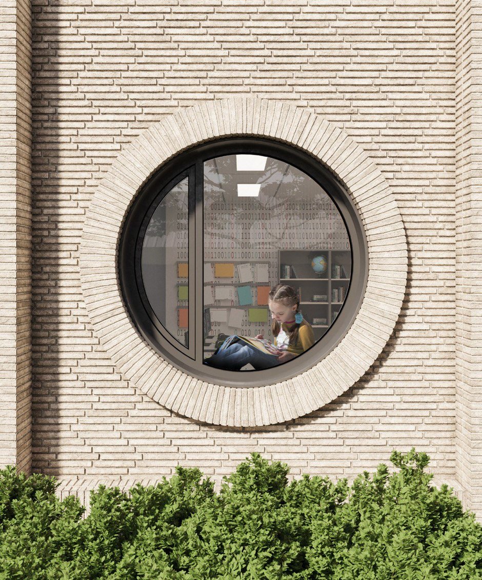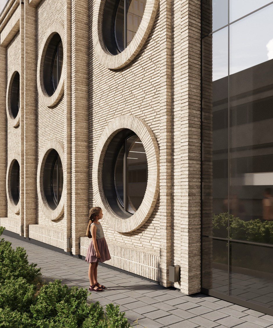 Застройка квартала и прилегающих территорий достаточно разномастная, поэтому первым вариантом было предложено максимально нейтральное архитектурное решение. Поскольку в близлежащих постройках — Дом печати, синагога, да и на существующем здании школы есть круглые окна, очень захотелось добавить их и в новом здании. Розы, люкарны, иллюминаторы, «бычьи глаза», перла барокко, слухи — все это частные случаи круглых окон, к которым у меня большая любовь! Вариант в белом керамическом кирпиче с круглыми окошками хорошо увязался с уже существующим зданием школы, а второй этаж со спортивным залом «растворили» структурным остеклением плюс стемалитом.
