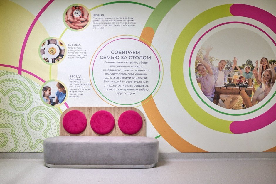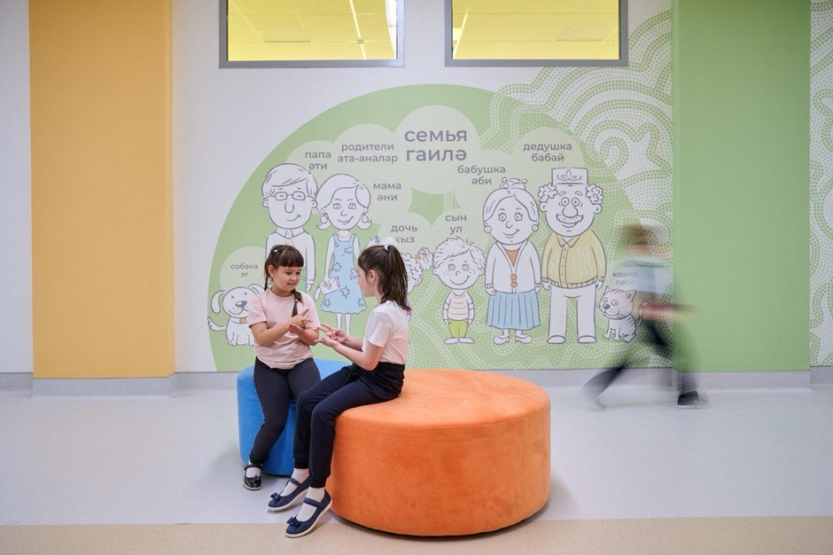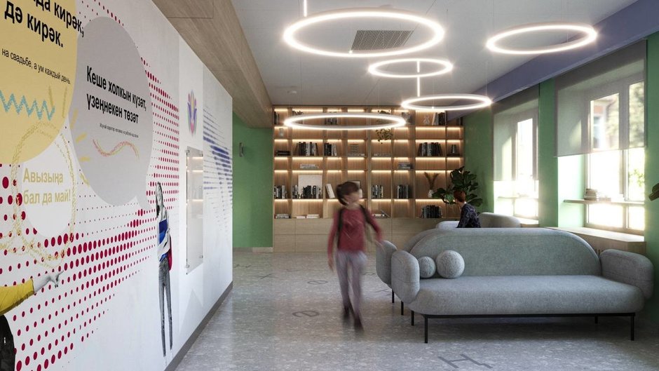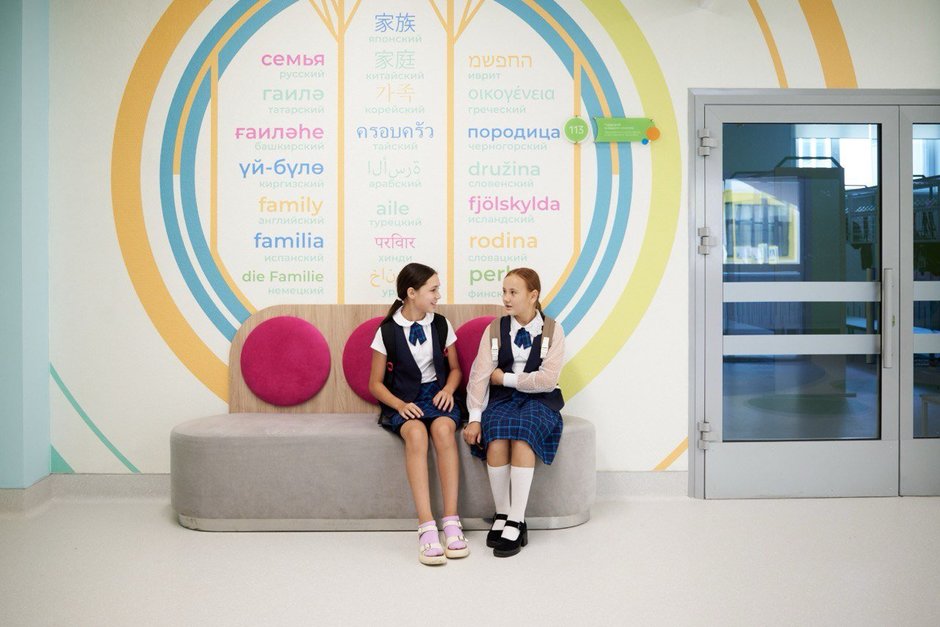 Вторая школа — с теплым и понятным названием «Гаиля». Название, кстати, это наше предложение, которое было с радостью принято, кроме того, прошлый год был годом семьи, и городские власти решили и район М-14 назвать «Гаиля». Интерьер школы мы выполнили в пастельных и теплых тонах. Основная тема — это семейный круг, поэтому графически здесь много кругов, а тема семьи прошла в совершенно разных интерпретациях: на стенах дети в блоке начальных классов знакомятся с составом семьи на разных языках, запоминая кто, кому и кем приходится. Далее есть блоки семейств химических элементов, животных, которые создают семьи, есть обширная карта, где страна — это наша семья, и обозначены национальности, которые ее населяют, а в столовой на основном панно семья за круглым столом, на котором традиционные русские и татарские блюда. Мы сделали акцент на создании не только познавательной, но и уютной, практически домашней атмосферы, и нам это удалось.