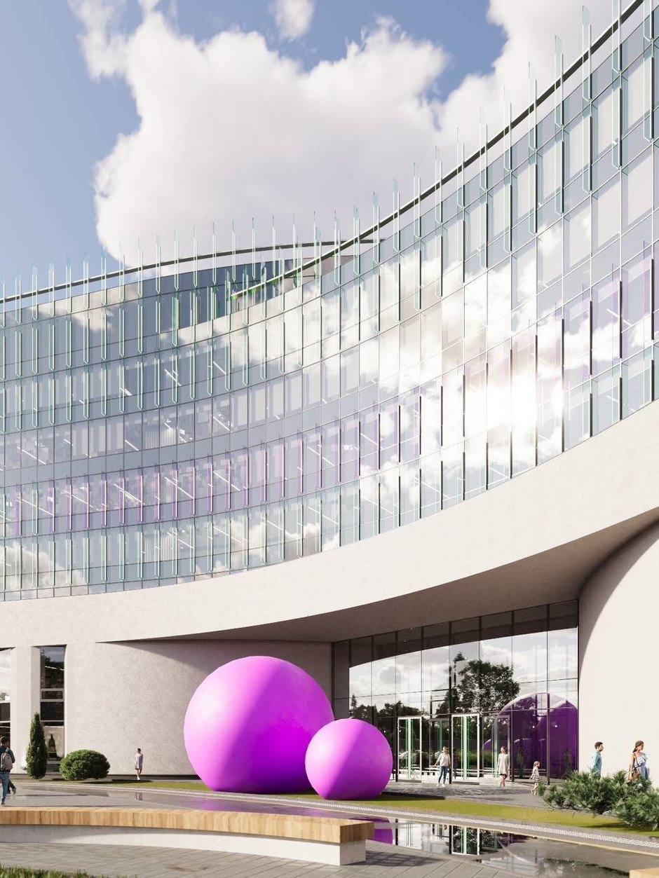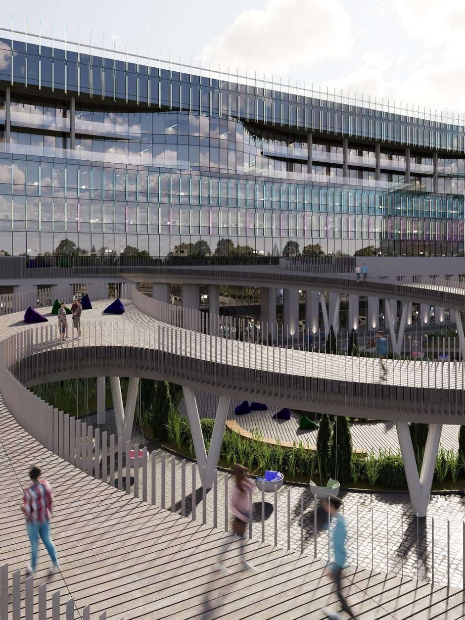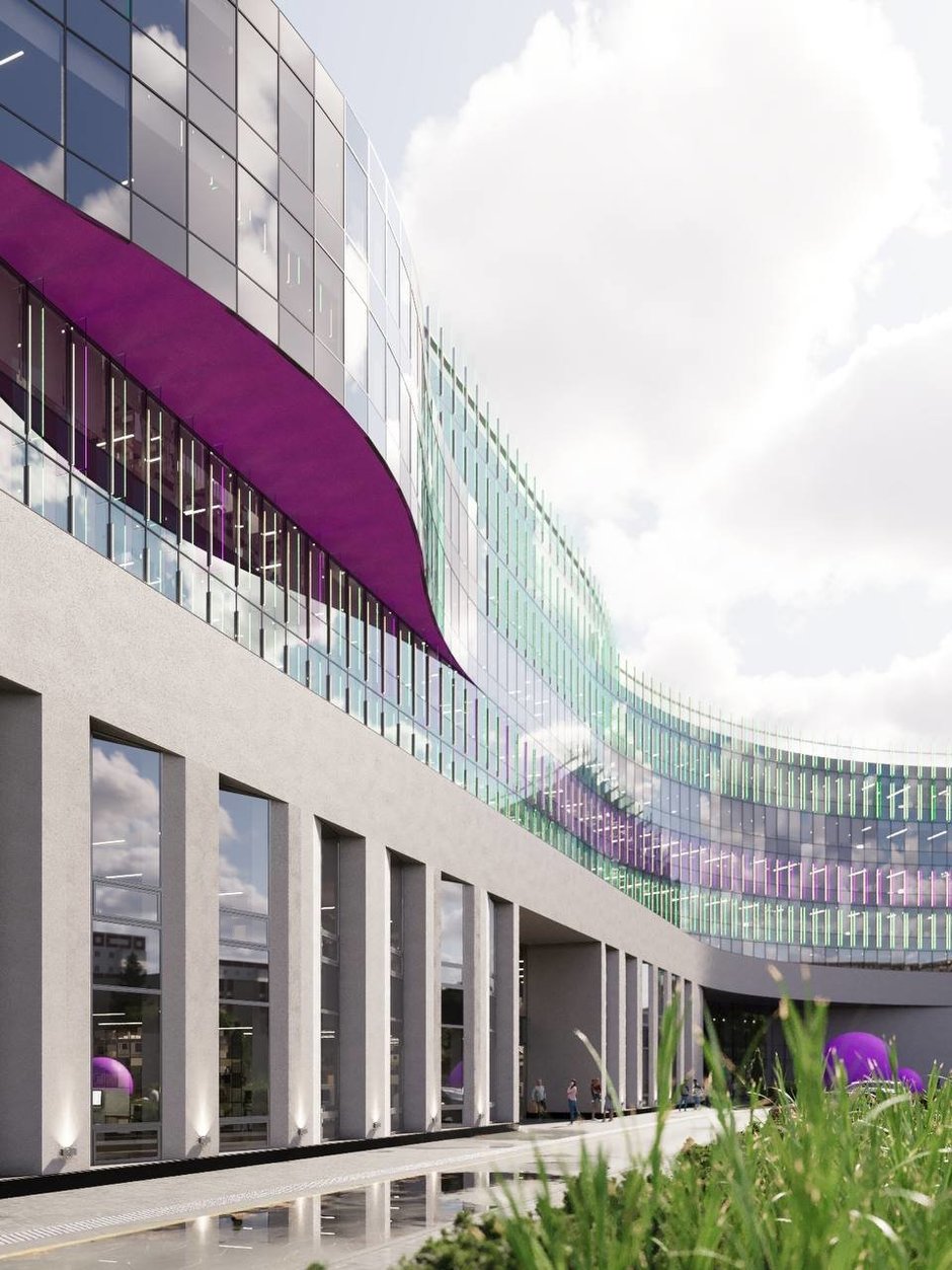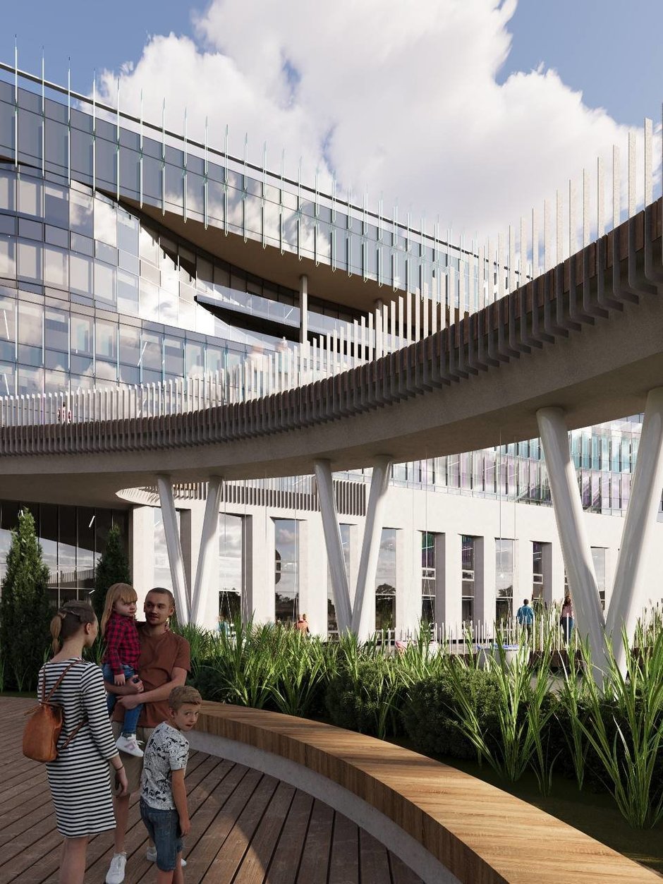 Дуги фасадов — это метафорические, архитектурные объятия, обнимаем маленьких пациентов и природу, отражая ее. Планировочно «объятия» образуют три зоны: первая — здесь организован сквер при больнице, вторая — городской сквер, третья — это прогулочная зона второго уровня благоустройства.