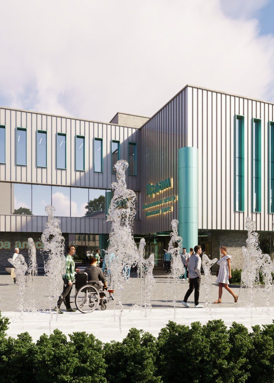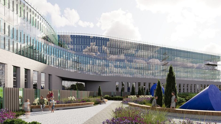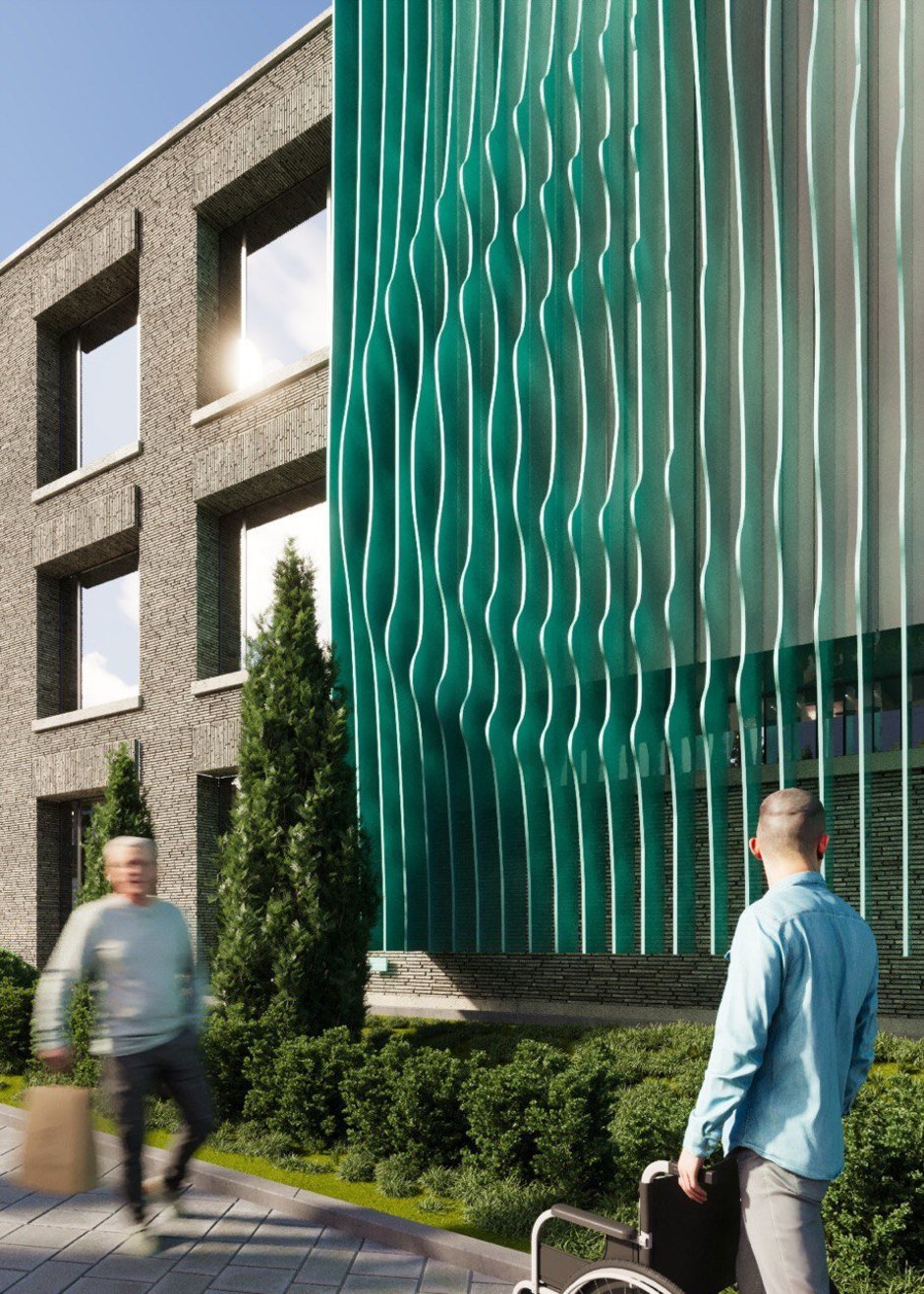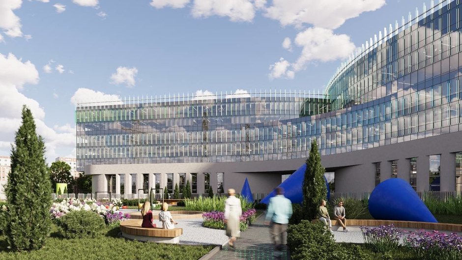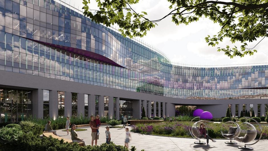 Дуги фасадов — это метафорические, архитектурные объятия, обнимаем маленьких пациентов и природу, отражая ее. Планировочно «объятия» образуют три зоны: первая — здесь организован сквер при больнице, вторая — городской сквер, третья — это прогулочная зона второго уровня благоустройства.