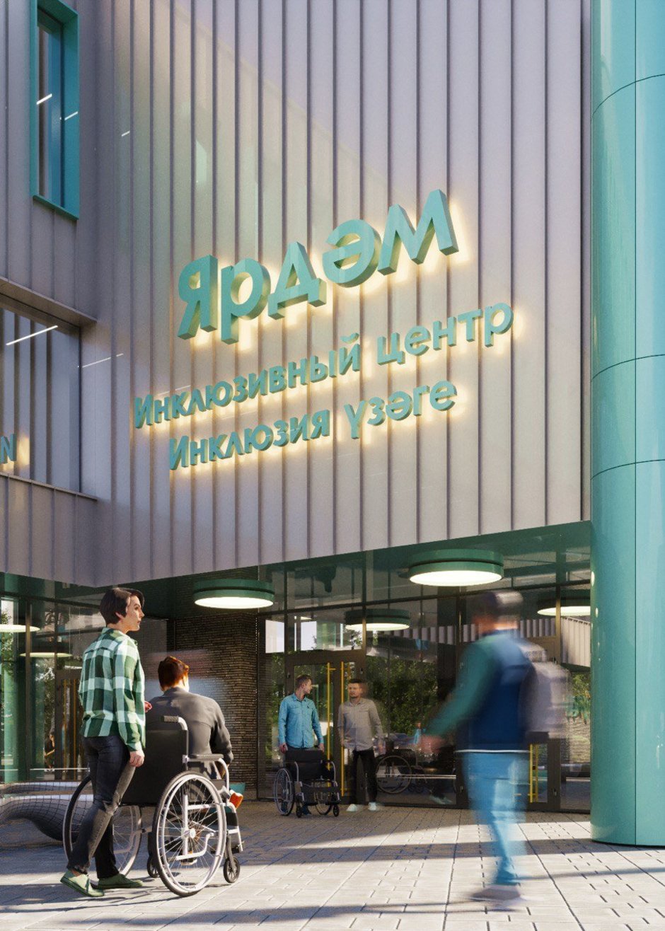 Здание замыкает архитектурный ансамбль мечети и спортивного комплекса, расположенные на оси сквера на улице Серова, который уже включает всевозможные аттракционы для инклюзии, к примеру, качели, на которых можно кататься на инвалидной коляске. Для людей с ОВЗ очень важна социальная адаптация.